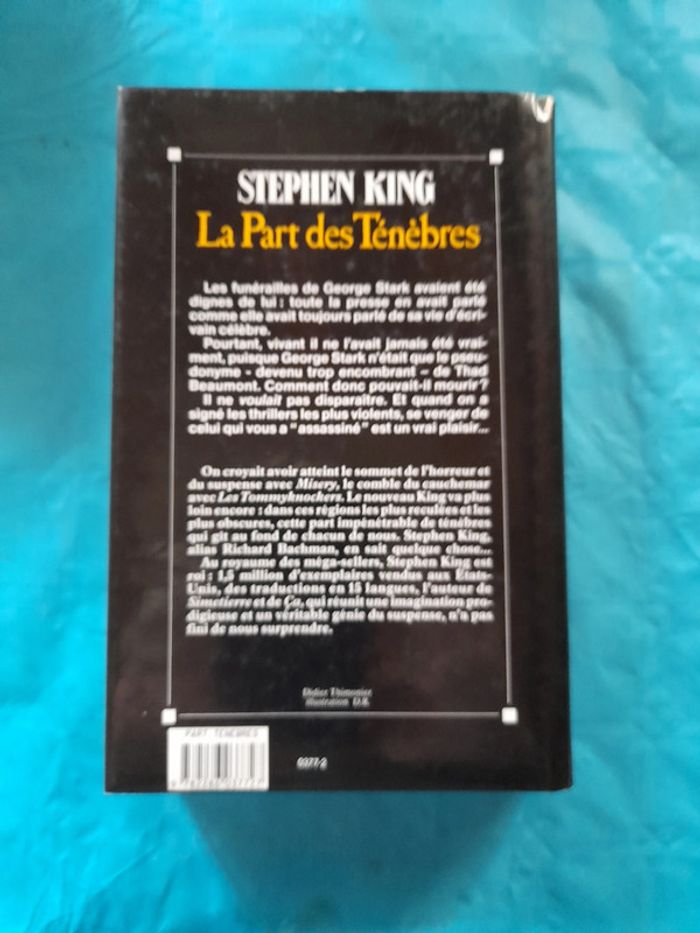 LA PART DES TENEBRES de Stephen KING Ed. Albin Michel Bon état Les funérailles de George Stark avaient été dignes de lui : toute la presse en avait parlé comme elle avait toujours parlé de sa vie d'écrivain célèbre. Pourtant, vivant il ne l'avait jamais été vraiment, puisque George Stark n'était que le pseudonyme - devenu trop encombrant - de Thad Beaumont. Comment donc pouvait-il mourir ? Il ne voulait pas disparaître. Et quand on a signé les thrillers les plus violents, se venger de celui qui vous a "assassiné" est un vrai plaisir... #martinekrvthrillers #martinekrvthrillersstephenking