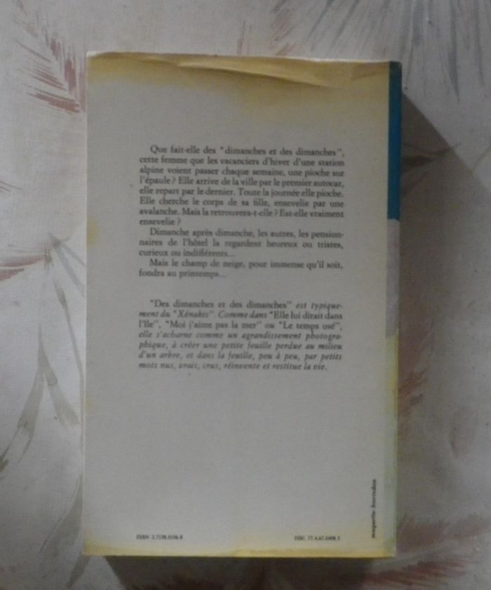 DES DIMANCHES ET DES DIMANCHES de Françoise XENAKIS Ed. Balland Etat d'usage pellicule plastique décollée, une page intérieure arrachée (pas de manque) Que fait-elle des "dimanches et des dimanches", cette femme que les vacanciers d'hiver d'une station alpine voient passer chaque semaine, une pioche sur l'épaule ? Elle arrive de la ville par le premier autocar, elle repart par le dernier. Toute la journée elle pioche. Elle cherche le corps de sa fille, ensevelie par une avalanche. Mais la retrouvera-t-elle ? Est-elle vraiment ensevelie ? Dimanche après dimanche, les autres, les pensionnaires de l'hôtel la regardent heureux ou tristes, curieux ou indifférents... Mais le champ de neige, pour immense qu'il soit, fondra au printemps. #martinekrvromans