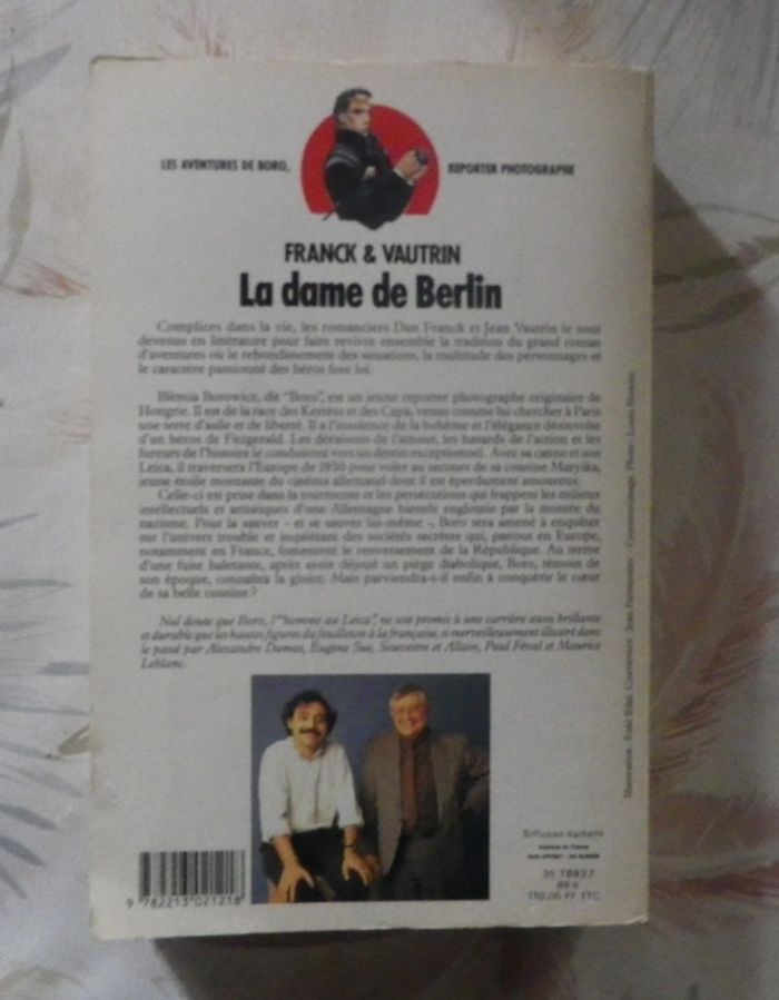 LA DAME DE BERLIN Les aventures de Boro, reporter photographe de FRANCK & VAUTRIN Ed. Fayard & Balland Bon état, couverture présentant quelques marques de pliure Complices dans la vie, les romanciers Dan Franck et Jean Vautrin le sont devenus en littérature pour faire revivre ensemble la tradition du grand roman d'aventures où le rebondissement des situations, la multitude des personnages et le caractère passionné des héros font loi. Blèmia Borowicz, dit "Boro", est un jeune reporter photographe originaire de Hongrie. Il est de la race des Kertész et des Capa, venus comme lui chercher à Paris une terre d'asile et de liberté. Il a l'insolence de la bohème et l'élégance désinvolte d'un héros de Fitzgerald. Les déraisons de l'amour, les hasards de l'action et les fureurs de l'histoire le conduiront vers un destin exceptionnel. Avec sa canne et son Leica, il traversera l'Europe de 1930 pour voler au secours de sa cousine Maryika, jeune étoile montante du cinéma allemand dont il est éperdument amoureux. Celle-ci est prise dans la tourmente et les persécutions qui frappent les milieux intellectuels et artistiques d'une Allemagne bientôt engloutie par la montée du nazisme. Pour la sauver, et se sauver lui-même, Boro sera amené à enquêter sur l'univers trouble et inquiétant des sociétés secrètes qui, partout en Europe, notamment en France, fomentent le renversement de la République. Au terme d'une fuite haletante, après avoir déjoué un piège diabolique, Boro, témoin de son époque, connaîtra la gloire. Mais parviendra-t-il enfin à conquérir le cœur de sa belle cousine ? #martinekrvromans