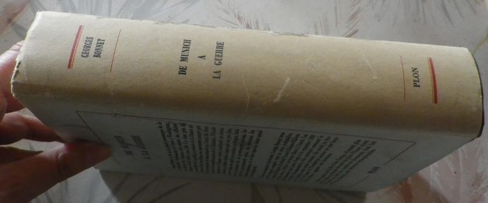 DE MUNICH A LA GUERRE par Georges BONNET Ed. Plon 1967 Bon état Couverture papier en état d'usage Livre en bon état, pages jaunies Georges Bonnet a été un des grands personnages de la IIIe République. Ambassadeur de France à Washington, puis ministre des Finances, enfin ministre des Affaires étrangères d'avril 1938 à mars 1940. Il a donc pris la responsabilité de la politique extérieure de la France au lendemain d'un Anschluss aussi passivement accepté par l'opinion nationale et internationale que l'avait été deux ans plus tôt la remilitarisation de la Rhénanie. Période angoissante où la France s'épuise à maintenir un réseau d'alliances que Hitler déchire chaque mois un peu plus, essaie de mettre sur pied la coopération soviétique, lutte contre la mauvaise foi du gouvernement polonais, les retards du gouvernement anglais, les hésitations des dirigeants américains et se débat dans un climat moral et social désastreux. Ouvrant ses dossiers loyalement, Georges Bonnet nous donne un exposé complet, étayé de textes irréfutables, du drame de Munich. Il éclaire l'accord Molotov-Ribbentrop qui laissa à Hitler les mains libres à l'ouest. Les pages consacrées aux jours d'août et de septembre 1939 sont riches d'enseignements, elles montrent comment la paix fut perdue, mais aussi comment elle aurait pu être sauvée si la France et l'Angleterre avaient eu une force militaire solide à opposer aux dictatures. Ouvrage capital sur la fin d'une Europe, d'autant plus précieux que les archives récentes du Quai d'Orsay ayant été brûlées en 1940, les nombreux documents dont fait état Georges Bonnet sont devenus irremplaçables. #martinekrvmilitaria