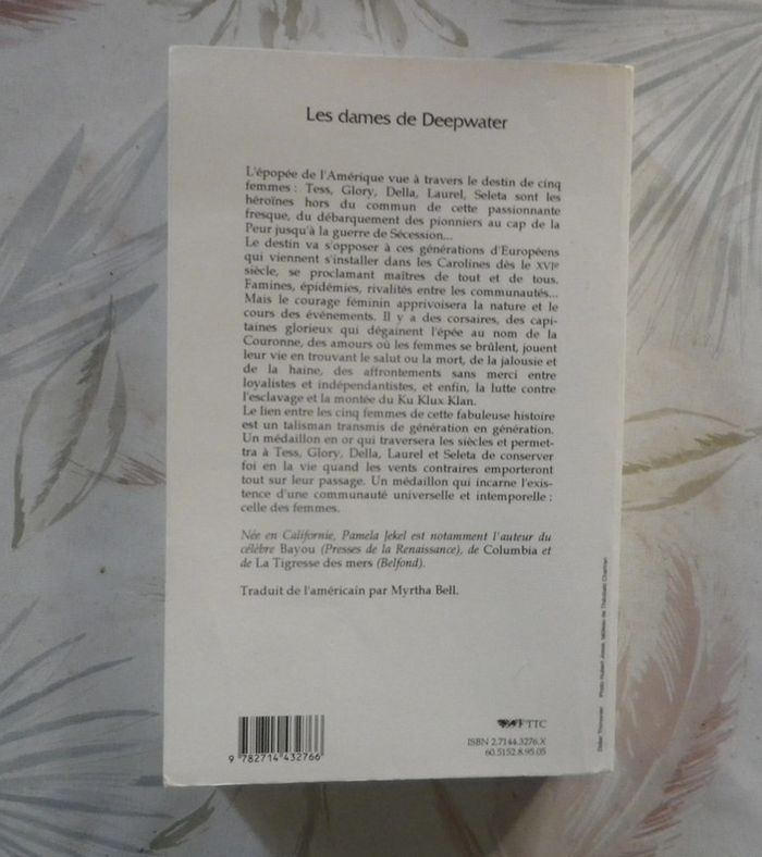 LES DAMES DE DEEPWATER de Pamela JEKEL Ed. Belfond Très bon état L'épopée de l'Amérique vue à travers le destin de cinq femmes : Tess, Glory, Della, Laurel, Seleta sont les héroïnes hors du commun de cette passionnante fresque, du débarquement des pionniers au cap de la Peur jusqu'à la guerre de Sécession... Le destin va s'opposer à ces générations d'Européen qui viennent s'installer dans les Carolines dès le XVIe siècle, se proclamant maîtres de tout et de tous. Famines, épidémies, rivalités entre les communautés... Mais le courage féminin apprivoisera la nature et le cours des événements. Il y a des corsaires, des capitaines glorieux qui dégainent l'épée au nom de la Couronne, des amours où les femmes se brûlent, jouent leur vie en trouvant le salut ou la mort, de la jalousie et de la haine, des affrontements sans merci entre loyalistes et indépendantistes, et enfin, la lutte contre l'esclavage et la montée du Ku Klux Klan. Le lien entre les cinq femmes de cette fabuleuse histoire est un talisman transmis de génération en génération. Un médaillon en or qui traversera les siècles et permettra à Tess, Glory, Della, Laure et Seleta de conserver foi en la vie quand les vents contraires emporteront tout sur leur passage. Un médaillon qui incarne l'existence d'une communauté universelle et intemporelle : celle des femmes. #martinekrvromans