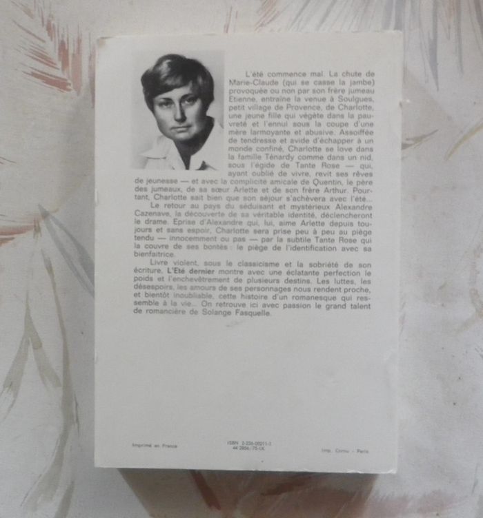 L'ETE DERNIER de Solange FASQUELLE Ed. Albin Michel 1975 Bon état L'été commence mal. La chute de Marie-Claude (qui se casse la jambe) provoquée ou non par son frère jumeau Etienne, entraîne la venue à Soulgues, petit village de Provence, de Charlotte, une jeune fille qui végète dans la pauvreté et l'ennui sous la coupe d'une mère larmoyante et abusive. Assoiffée de tendresse et avide d'échapper à un monde confiné, Charlotte se love dans la famille Ténardy comme dans un nid sous l'égide de Tante Rose - qui, ayant oublié de vivre, revit ses rêves de jeunesse - et avec la complicité amicale de Quentin, le père des jumeaux, de sa soeur Arlette et de son frère Arthur. Pourtant, Charlotte sait bien que son séjour s'achèvera avec l'été... Le retour au pays du séduisant et mystérieux Alexandre Cazenave, la découverte de sa véritable identité, déclencheront le drame. Eprise d'Alexandre qui, lui, aime Arlette depuis toujours et sans espoir, Charlotte sera prise peu à peu au piège tendu - innocemment ou pas - par la subtile Tante Rose qui la couvre de ses bontés : le piège de l'identification avec sa bienfaitrice. Livre violent, sous le classicisme et la sobriété de son écriture, "L'Eté dernier" montre avec une éclatante perfection le poids et l'enchevêtrement de plusieurs destins. Les luttes, les désespoirs, les amours de ses personnages nous rendent proche, et bientôt inoubliable, cette histoire d'un romanesque qui ressemble à la vie... #martinekrvromans