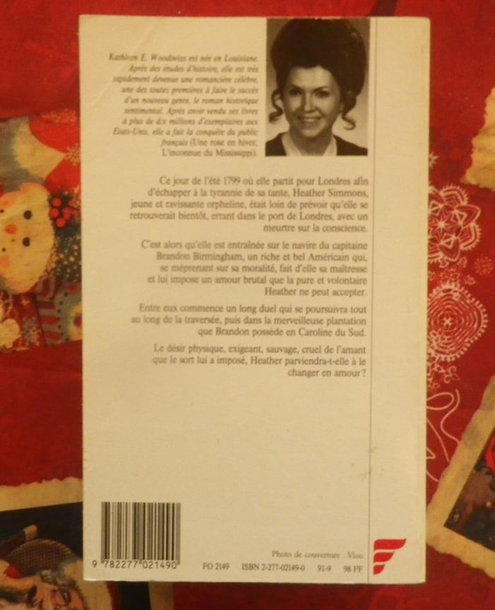 QUAND L'OURAGAN S'APAISE de Kathleen E.WOODIWISS Ed. Flamme Très bon état intérieur du livre,MAIS couverture présentant des marques de pliure dans les angles et des traces de frottement Ce jour de l'été 1799 où elle partit pour Londres afin d'échapper à la tyrannie de sa tante, Heather Simmons, jeune et ravissante orpheline, était loin de prévoir qu'elle se retrouverait bientôt, errant dans le port de Londres, avec un meurtre sur la conscience. Elle est alors entraînée sur le navire du capitaine Brandon Birmingham, riche et bel Américain qui, se méprenant sur sa moralité, fait d'elle sa maîtresse et lui impose un amour brutal que la pure et volontaire Heather ne peut accepter. Entre eux commence un long duel qui se poursuivra tout au long de la traversée, puis dans la merveilleuse plantati on que Brandon possède en Caroline du Nord. Le désir physique, exigeant, sauvage et cruel de l'amant que le sort lui a imposé, Heather parviendra-t-elle à le changer en amour ? #martinekrvromans