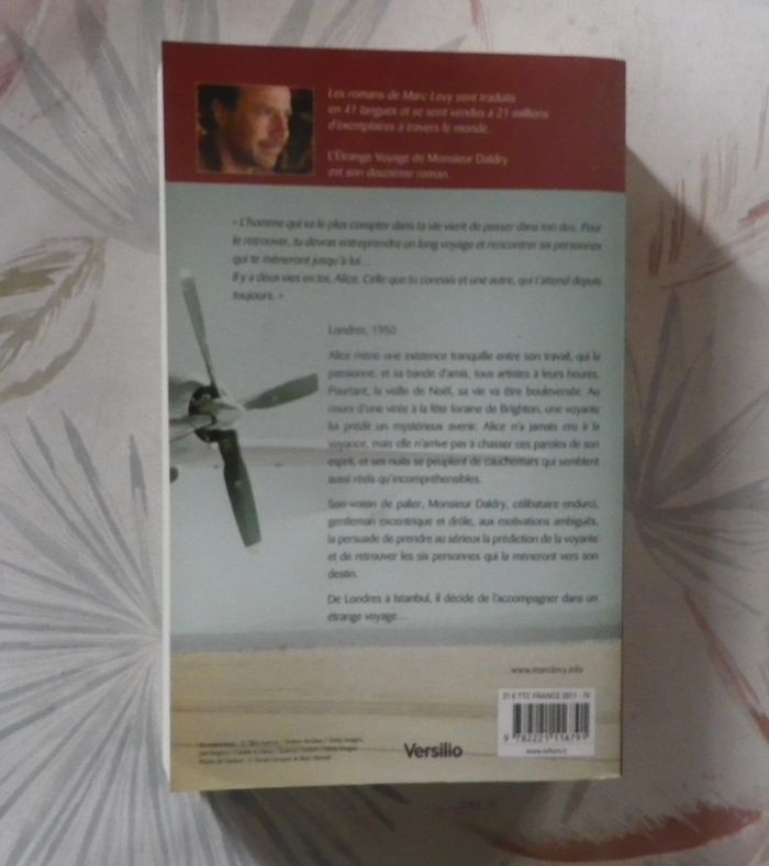 L'ETRANGE VOYAGE DE MONSIEUR DALDRY de Marc LEVY Editions Robert Laffont Très bon état "L'homme qui va le plus compter dans ta vie vient de passer dans ton dos. Pour le retrouver, tu devras entreprendre un long voyage et rencontrer six personnes qui te mèneront jusqu'à lui... Il y a deux vies en toi, Alice. Celle que tu connais et une autre, qui t'attend depuis toujours." Londres, 1950. Alice mène une existence tranquille entre son travail, qui la passionne, et sa bande d'amis, tous artistes à leurs heures. Pourtant, la veille de Noël, sa vie va être bouleversée. Au cours d'une virée à la fête foraine de Brighton, une voyante lui prédit un mystérieux avenir. Alice n'a jamais cru à la voyance, mais elle n'arrive pas à chasser ces paroles de son esprit, et ses nuits se peuplent de cauchemars qui semblent aussi réels qu'incompréhensibles. Son voisin de palier, Monsieur Daldry, célibataire endurci, gentlemant excentrique et drôle, aux motivations ambiguës, la persuade de prendre au sérieux la prédiction de la voyante et de retrouver les six personnes qui la mèneront vers son destin. De Londres à Istanbul, il décide de l'accompagner dans un étrange voyage... #martinekrvromans #martinekrvromanslevy #martinekrvletrangevoyagedemonsieurdaldry