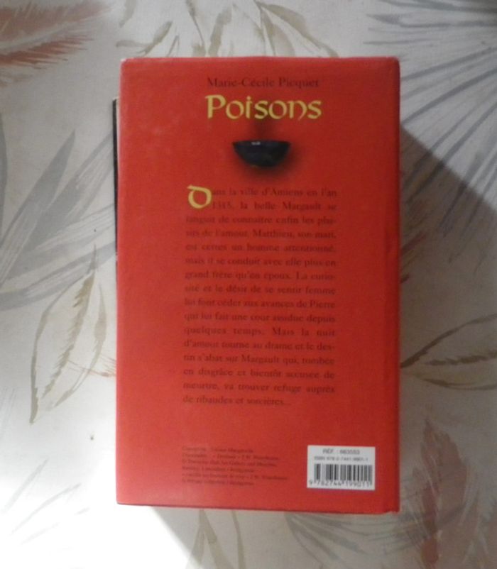 POISONS de Marie-Cécile PICQUET Ed. France Loisirs Bon état - quelques rousseurs sur la tranche Dans la ville d'Amiens en l'an 1315, la belle Margault se languit de connaître enfin les plaisirs de l'amour. Matthieu, son mari, est certes un homme attentionné, mais il se conduit avec elle plus en grand frère qu'en époux. La curiosité et le désir de se sentir femme lui font céder aux avances de Pierre qui lui fait une cour assidue depuis quelque temps. Mais la nuit d'amour tourne au drame et le destin s'abat sur Margault qui, tombée en disgrâce et bientôt accusée de meurtre, va trouver refuge auprès de ribaudes et de sorcières... #martinekrvromans