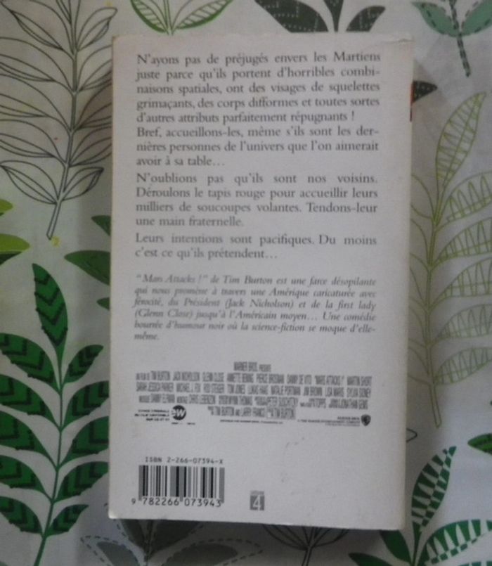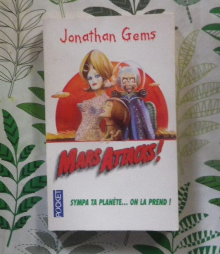 MARS ATTACKS ! de Jonathan GEMS Ed. Pocket - Science-Fiction Bon état une dédicace en 2ème de couverture N'ayons pas de préjugés envers les Martiens juste parce qu'ils portent d'horribles combinaisons spatiales, ont des visages de squelettes grimaçants, des corps difformes et toutes sortes d'autres attributs parfaitement répugnants ! Bref, accueillons-les, même s'ils sont les dernières personnes de l'univers que l'on aimerait avoir à sa table... N'oublions pas qu'ils sont nos voisins. Déroulons le tapis rouge pour accueillir leurs milliers de soucoupes volantes. Tendons-leur une main fraternelle. Leurs intentions sont pacifiques. Du moins c'est ce qu'ils prétendent... #martinekrvsfetfantastique