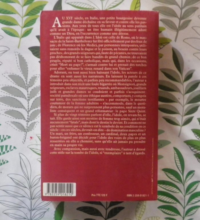 Au XVIè siècle, en Italie, une petite bourgeoise devenue grande dame déchaîne en sa faveur et contre elle les passions. Aux yeux de tous, elle est l'idole au sens puritain qu'il avait à l'époque : un être humain illégitimement adoré comme un Dieu, en l'occurrence comme une déesse. L'Italie qui apparaît dans "L'Idole" est celle de Rome, où le massacre de la Saint-Barthélémy, fut fêté officiellement par des feux de joie ; de Florence où les Medici, par personnes interposées, utilisaient sans remords la dague et le poison, au besoin contre leurs proches ; des grands seigneurs qui, faute de pécunes, ne trouvaient pas déshonorant de se faire bandits de grands chemins ; de ce bon peuple, réputé si bon catholique, mais qui, dans les occasions, criait "Mort au pape !", s'armait contre lui et prenait des torches pour aller "enfumer le vieux renard dans son Vatican". Adorant, ou tout aussi bien haïssant l'idole, les acteurs de ce drame en sont aussi les narrateurs. En laissant la parole à ces témoins peu objectifs, et parfois peu recommandables, l'auteur a introduit dans son récit une foule bigarrée où Monsignori, grands seigneurs, esclaves mauresques, truands, ambassadeurs, joailliers, juifs et grandes dames se coudoient et parfois s'acoquinent : société paradoxale où une éthique austère, comportant, y compris sur terre, des sanctions terrifiantes - par ex, le meurtre coutumier de la femme adultère - s'accomode, dans le quotidien, de moeurs qui ne surprennent plus personne, sauf un moraliste conséquent et un grand réformateur : le pape Sixte Quint. (...)