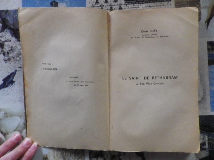 LE SAINT DE BETHARRAM Le bon Père Garicoïts par D. BUZY Supérieur général des Prêtres du Sacré-Coeur de Bétharram Imprimerie des Orphelins-Apprentis 1954 Etat correct Couverture brune souple et imprimée. Taches sur la couverture. Bords de la couverture frottés. Pages non-ébarbées et non-coupées. Papier bruni. Bas de la tranche avant fendu sur 2 cm Quelques marques de pliure Coin inférieur droit de la 1ère de couverture manquant #martinekrvreligion
