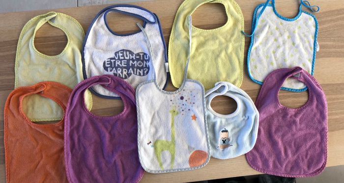 Lot de neuf bavoirs en très bon état. Coloris divers.