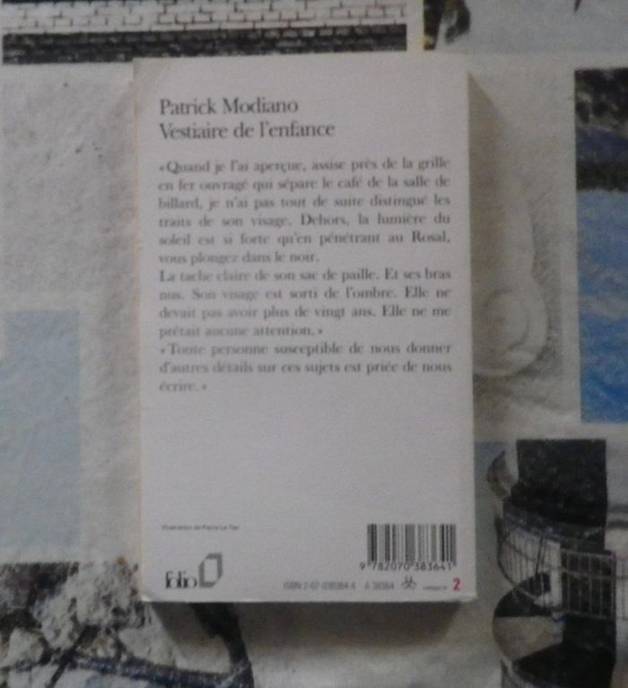 VESTIAIRE DE L'ENFANCE de Patrick MODIANO Ed. Folio 2253 Très bon état "Quand je l'ai aperçue, assise près de la grille en fer ouvragé qui sépare le café de la salle de billard, je n'ai pas tout de suite distingué les traits de son visage. Dehors, la lumière du soleil est si forte qu'en pénétrant au Rosal, vous plongez dans le noir. La tache claire de son sac de paille. Et ses bras nus. Son visage est sorti de l'ombre. Elle ne devait pas avoir plus de vingt ans. Elle ne me prêtait aucune attention." "Toute personne susceptible de nous donner d'autres détails sur ces sujets est priée de nous écrire." #martinekrvromans