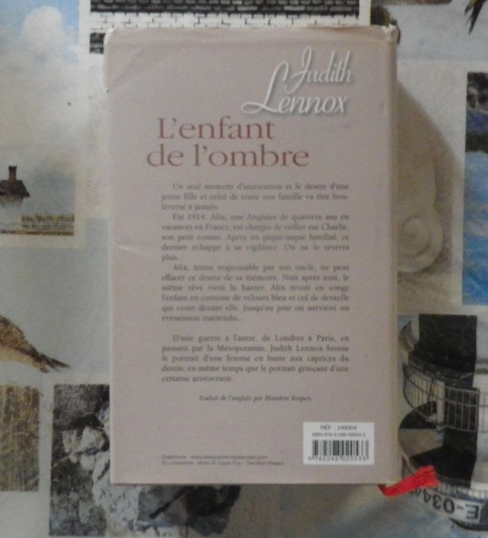 L'ENFANT DE L'OMBRE de Judith LENNOX Ed. France Loisirs Bon état couverture papier un peu défraîchie et déchirée sur les angles pages jaunies Un seul moment d'inattention et le destin d'une jeune fille et celui de toute une famille va être bouleversé à jamais. En 1914, Alix, une Anglaise de quatorze ans en vacances en France, est chargée de veiller sur Charlie, son petit cousin. Après un pique-nique familial, ce dernier échappe à sa vigilance. On ne le reverra plus... Alix, tenue responsable par son oncle, ne peut effacer ce drame de sa mémoire. Nuit après nuit, le même rêve vient la hanter. Alix revoit en songe l'enfant en costume de velours bleu et col de dentelle qui court devant elle. Jusqu'au jour où survient un événement inattendu... D'une guerre à l'autre, de Londres à Paris, en passant par la Mésopotamie, Judith Lennox brosse le portrait d'une femme en butte aux caprices du destin, en même temps que le portrait grinçant d'une certaine aristocratie. #martinekrvromans