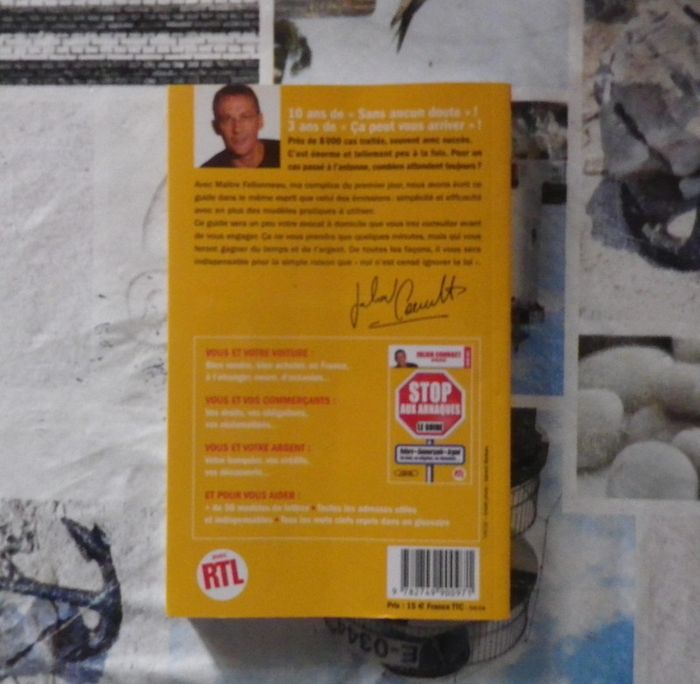 STOP AUX ARNAQUES Le Guide par Julien COURBET Ed. Michel Lafon Très bon état Près de 8000 cas traités, souvent avec succès. C'est énorme et tellement peu à la fois. Pour un cas passé à l'attente, combien attendent toujours ? Avec Maître Fellonneau, ma complice du premier jour, nous avons écrit ce guide dans le même esprit que celui des émissions : simplicité et efficacité avec en plus des modèles pratiques à utiliser. Ce guide sera un peu votre avocat à domicile que vous irez consulter avant de vous engager. Ca ne vous prendra que quelques minutes, mais qui vous feront gagner du temps et de l'argent. De toutes les façons, il vous sera indispensable pour la simple raison que "nul n'est censé ignorer la loi". Julien Courbet Sommaire : - Vous et votre voiture (bien vendre, bien acheter, en France, à l'étranger, neuve, d'occasion...) - Vous et vos commerçants (vos droits, vos obligations, vos réclamations...) - Vous et votre argent (votre banquier, vos crédits, vos découverts...) - Et pour vous aider : + de 50 modèles de lettres, toutes les adresses utiles et indispensables, tous les mots clefs repris dans un glossaire.