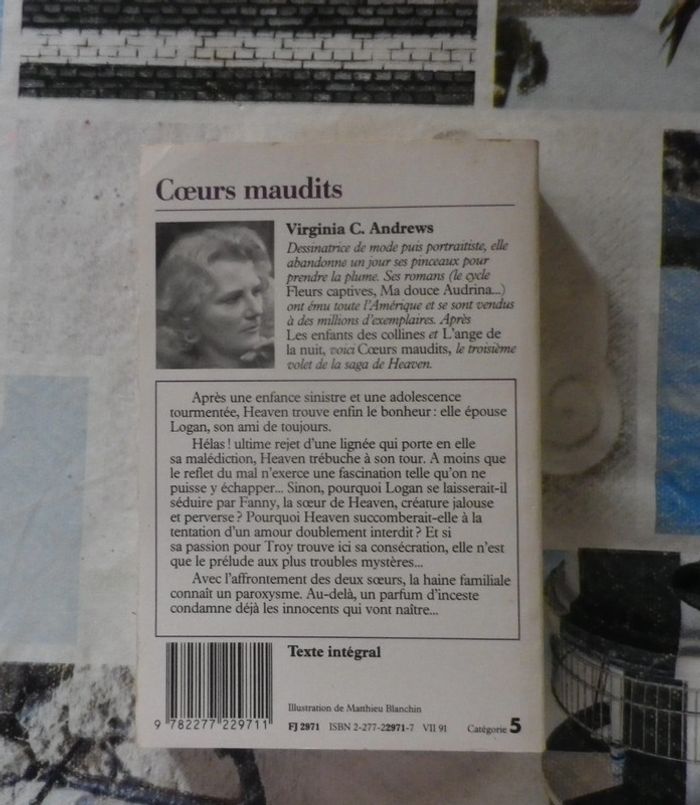 COEURS MAUDITS Tome 3 de la saga de HEAVEN de Virginia C. ANDREWS Ed. J'ai Lu Très bon état à part pages jaunies Après une enfance sinistre et une adolescence tourmentée, Heaven trouve enfin le bonheur : elle épouse Logan, son ami de toujours. Hélas ! ultime rejet d'une lignée qui porte en elle sa malédiction, Heaven trébuche à son tour. A moins que le reflet du mal n'exerce une fascination telle qu'on ne puisse y échapper... Sinon, pourquoi Logan se laisserait-il séduire par Fanny, la soeur de Heaven, créature jalouse et perverse ? Pourquoi Heaven succomberait-elle à la tentation d'un amour doublement interdit ? Et si sa passion pour Troy trouve ici sa consécration, elle n'est que le prélude aux plus troubles mystères... Avec l'affrontement des deux soeurs, la haine familiale connaît un paroxysme. Aud-delà, un parfum d'inceste condamne déjà les innocents qui vont naître... #martinekrvromans #martinekrvromansandrews
