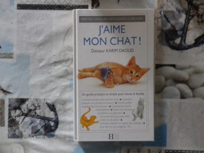 J'AIME MON CHAT ! par Docteur Karim DAOUD Ed. Hachette Bon état Un guide pratique et simple pour toute la famille . Comment choisir votre premier chat ? . Comment préparer son arrivée à la maison ? . Contre quelles maladies faut-il le vacciner ? . Comment le nourrir correctement ? . Quels sont les soins quotidiens à lui apporter , . Comme faire pour que votre chatte ait des petits ? . Comment dépister et soigner ses maladies ? . Que faire en cas d'urgence ? Etc