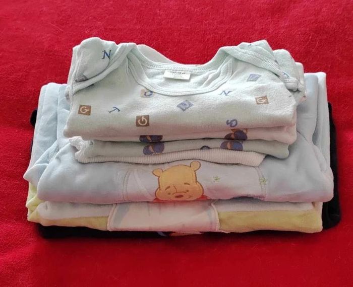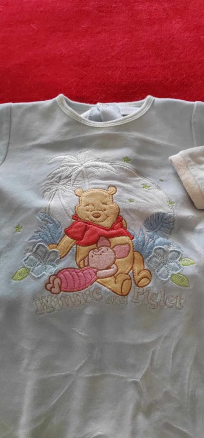 Lot Bodies et pyjamas hiver 6 mois (7 pièces) : -4 Bodies manches longues -3 pyjamas (marque Disney, Kitchoun Kiabi et Absorba)