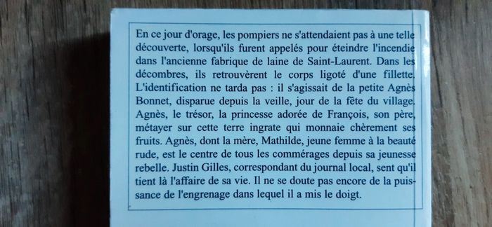 De Laurent Cabrol En ce jour d'orage, les pompiers ne s'attendaient pas à une telle découverte, lorsqu'ils furent appelés pour éteindre l'incendie dans l'ancienne fabrique de laine de Saint-Laurent. Dans les décombres, ils retrouvèrent le corps ligoté d'une fillette. L'identification ne tarda pas : il s'agissait de la petite Agnès Bonnet, disparue depuis la veille, jour de la fête du village. Agnès, le trésor, la princesse adorée de François, son père, métayer sur cette terre ingrate qui monnaie chèrement ses fruits. Agnès, dont la mère, Mathilde, jeune femme à la beauté rude, est le centre de tous les commérages depuis sa jeunesse rebelle. Justin Gilles, correspondant du journal local, sent qu'il tient là l'affaire de sa vie. Il ne se doute pas encore de la puissance de l'engrenage dans lequel il a mis le doigt.