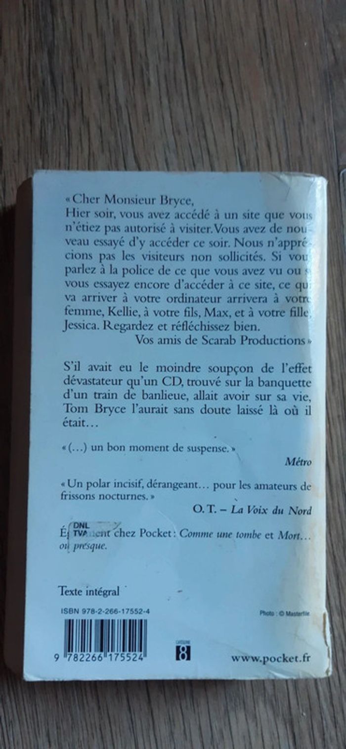 Dernière de couverture tachée S'il avait eu le moindre soupçon de l'effet dévastateur qu'un CD, trouvé sur la banquette d'un train de banlieue allait avoir sur sa vie, Tom Bryce l'aurait sans doute laissé là où il était...