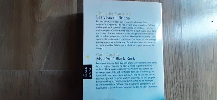 Les yeux de Briana, Kimberley Van Meter Dix ans que Kara n'était pas retournée à Lantern Cove. Aujourd'hui agent du FBI, elle revient pour résoudre « l'affaire du baby-sitter », comme l'ont baptisée les médias, et arrêter un kidnappeur d'enfants. Une enquête à haut risque pour Kara, qui redoute les sentiments brûlants que pourrait réveiller en elle sa collaboration avec l'officier Matthew Beauchamp. Ses sentiments, mais aussi la révélation d'un secret qu'elle protège précieusement depuis dix ans : de sa liaison avec Matthew est née une adorable Briana, qui a hérité du regard bleu azur de son père. Mystère à Black Rock, Carla Cassidy Lorsqu'on informe Edie que son grand-père semble avoir perdu la tête, la jeune femme ne peut y croire et prend la route de Black Rock. Aussi, quand le vieil homme est agressé peu de temps après, Edie est confortée dans son intuition qu'on lui veut du mal. Mais, seule sur place, elle ne sait vers qui se tourner. jusqu'à ce qu'un soutien inattendu lui soit proposé : Benjamin Grayon, l'adjoint du shérif, offre de les héberger, le temps d'éclaircir l'affaire. Une troublante perspective, qui bouleverse la jeune femme bien plus qu'elle ne veut l'admettre.