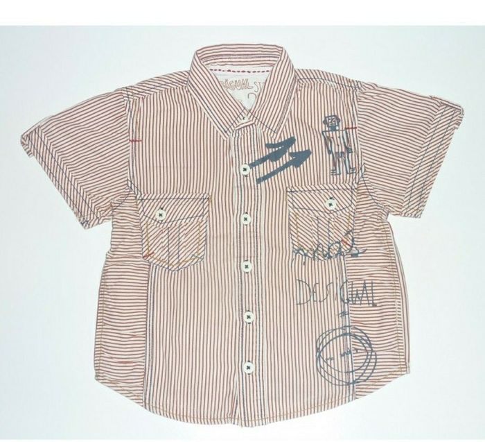 Chemise de marque DESIGUAL aux couleurs vives de la marque, en excellent état. Rayures de couleur paprika et inscriptions noires décalées. Le petit plus ? Son look 100% original ! Excellent état Desigual Vide dressing professionnel