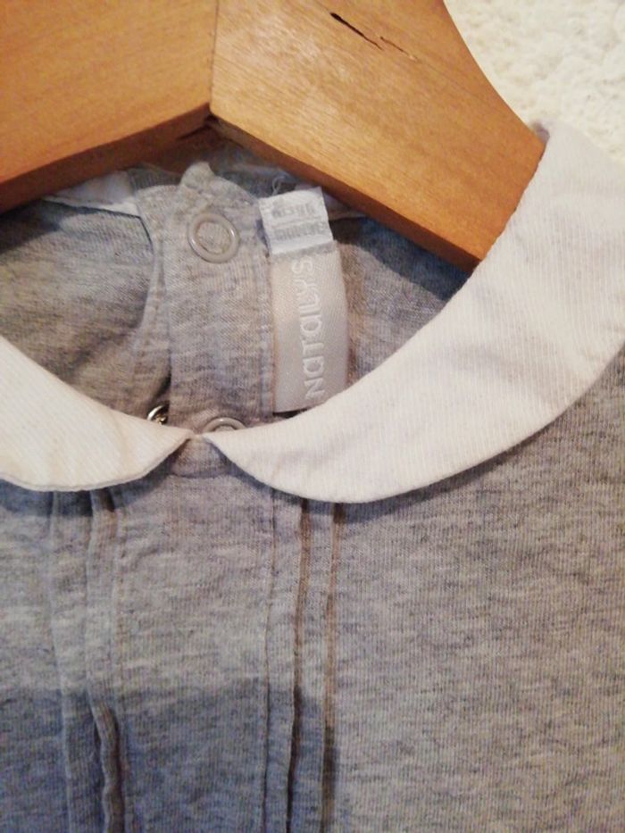 Tee-shirt à manches longues gris clair, col claudine blanc (grisé avec les lavages). Taille 36 mois. En parfait état.