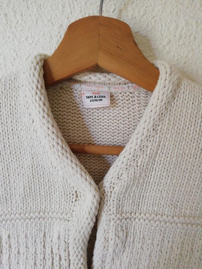 Gilet en gros maille, crème. Une pression à l'avant. Taille 3 ans En très bon état