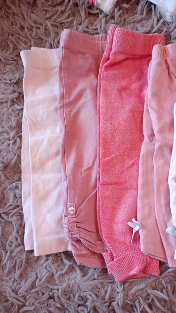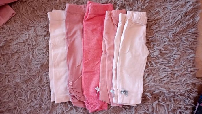 Lot de 5 leggings rose. Certains ont des noeuds en bas, d'autres des boutons. Taille 6 mois. Très bon état. Disponible à l'unité également.