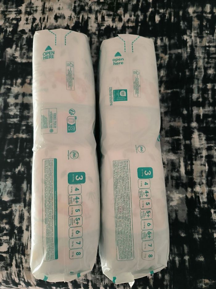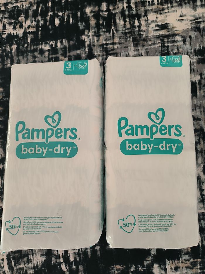 Lot de 2 paquets de couches 106 couches Pampers taille 3 (6-10kg) Paquets neufs, non ouverts Ma fille a changé de taille 📦 Envoie rapide et soigné