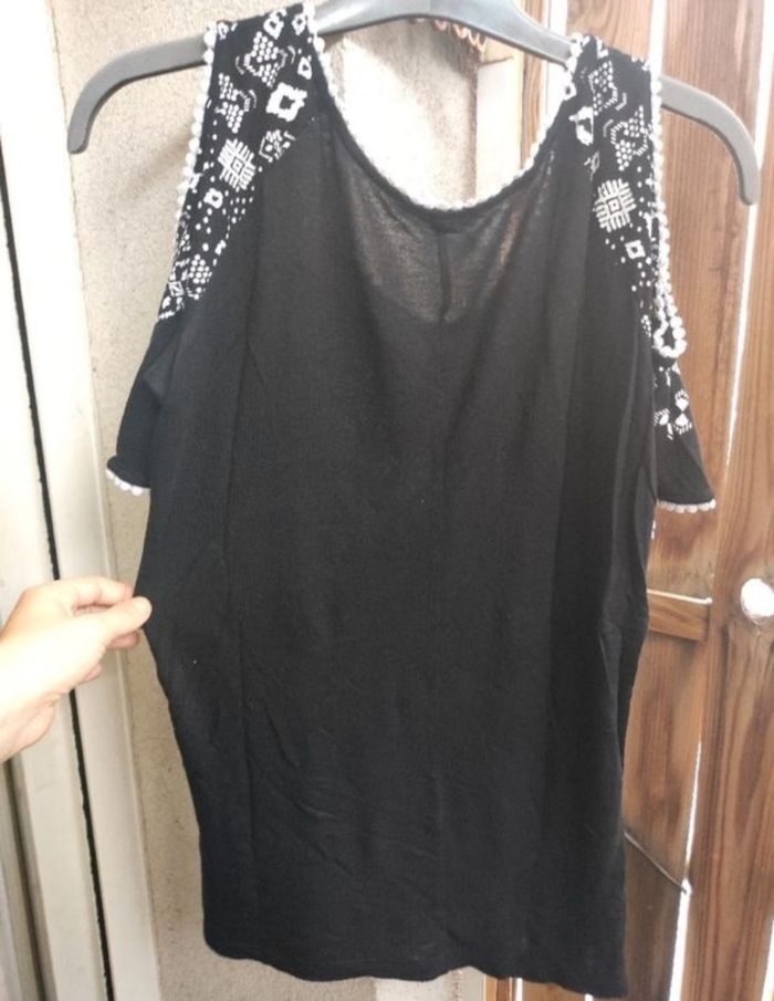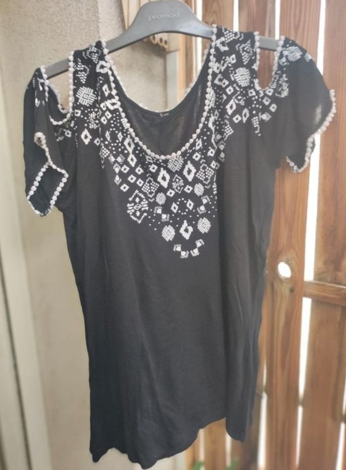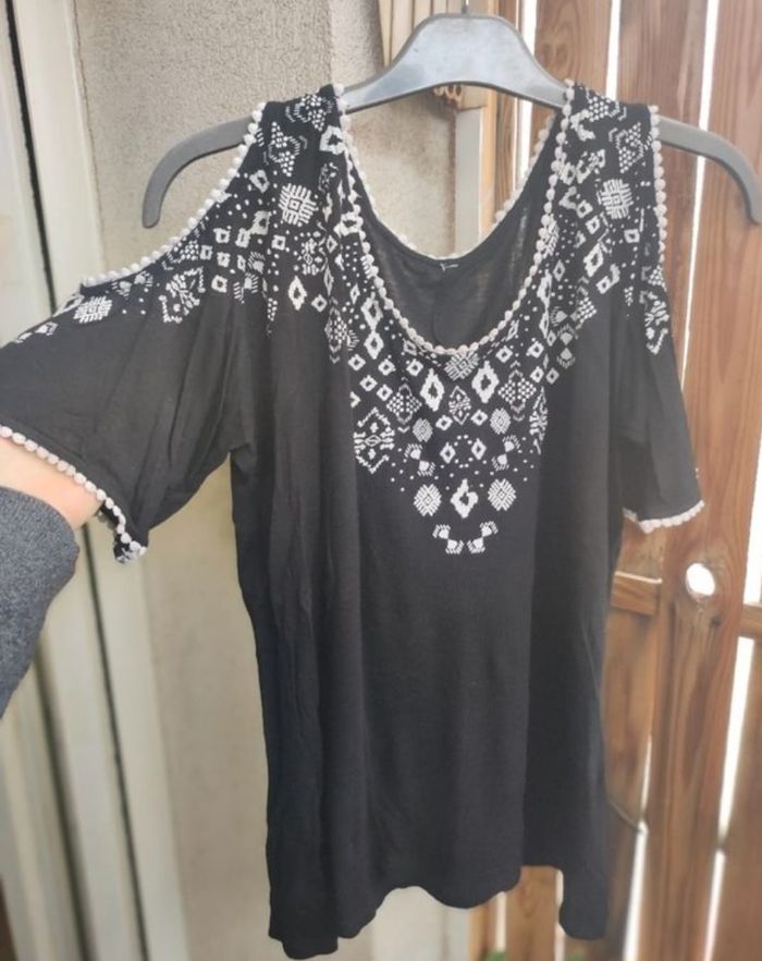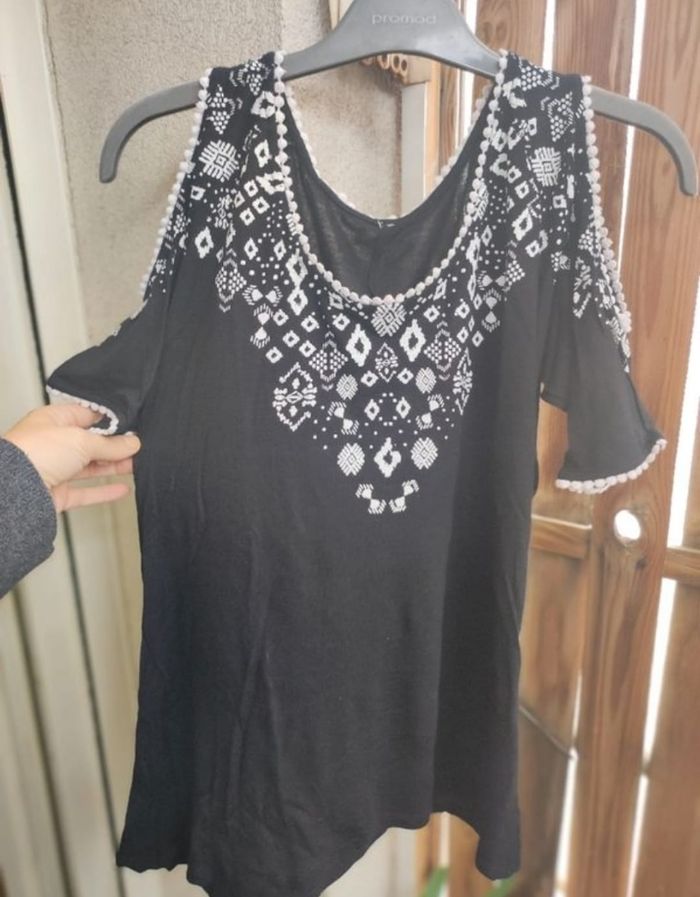 Tee shirt à épaules dénudées a motifs et matière fluide et légère, agréable a porter, taille unique, s'adapte à toutes morphologies ( 36 au 40) car elasthanne.