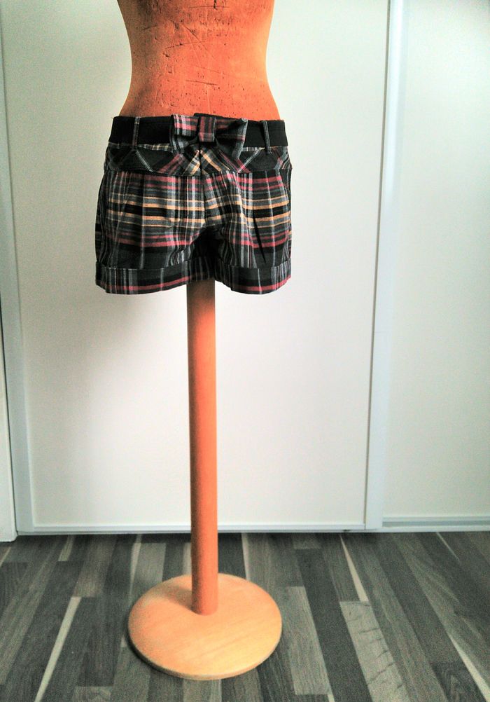 Très joli short gris à carreaux rouges, jaunes et noirs. Ceinture élastique avec noeud. Taille 38 Sans marque Très bon état