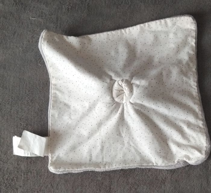 Doudou carre plat hippopotame en velours de couleur gris et de l autre côté en tissus de couleur blanc à pois Écriture brodées sur le bas du doudou ' pour t apprendre la tendresse " et motif cœur jaune