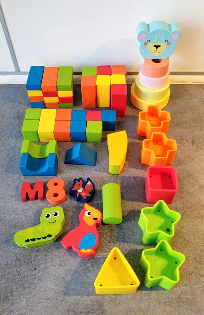 45 pièces de construction diverses en bois. + En bonus 5 formes géométriques en plastique. Bon état général