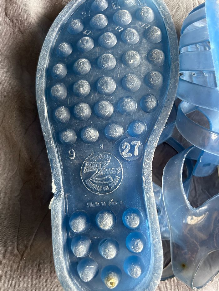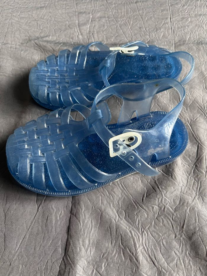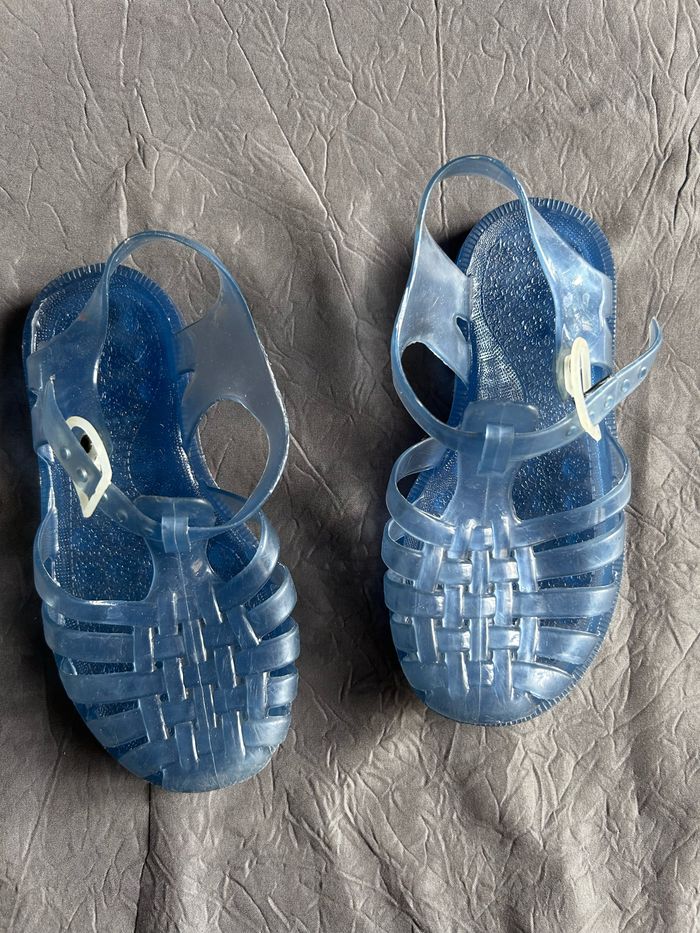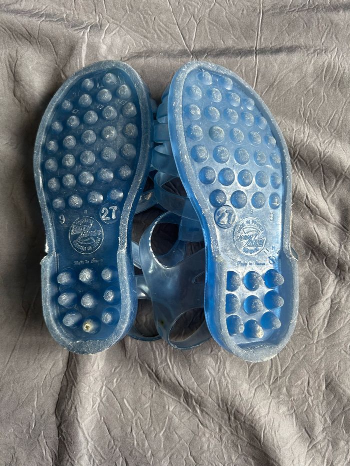 Sandales plastiques, « méduses » pour la plage. Pointure 27 en plastique transparent bleu. En très bon état.