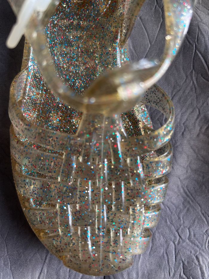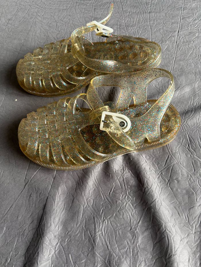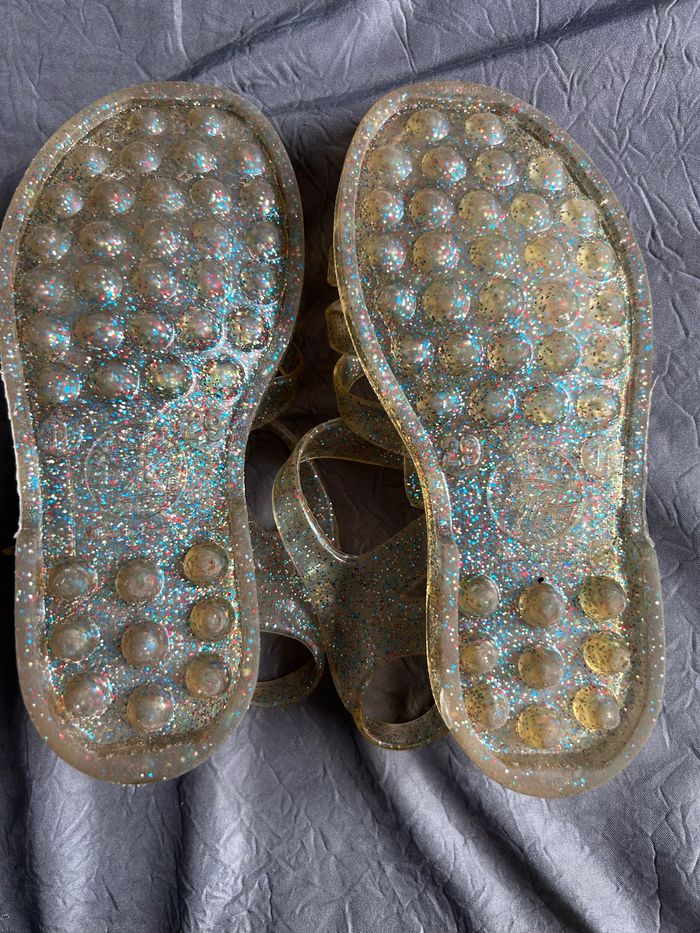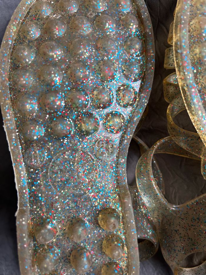 Sandales plastiques, « méduses » pour la plage. Pointure 29 en plastique transparent à paillettes multicolores. En très bon état.