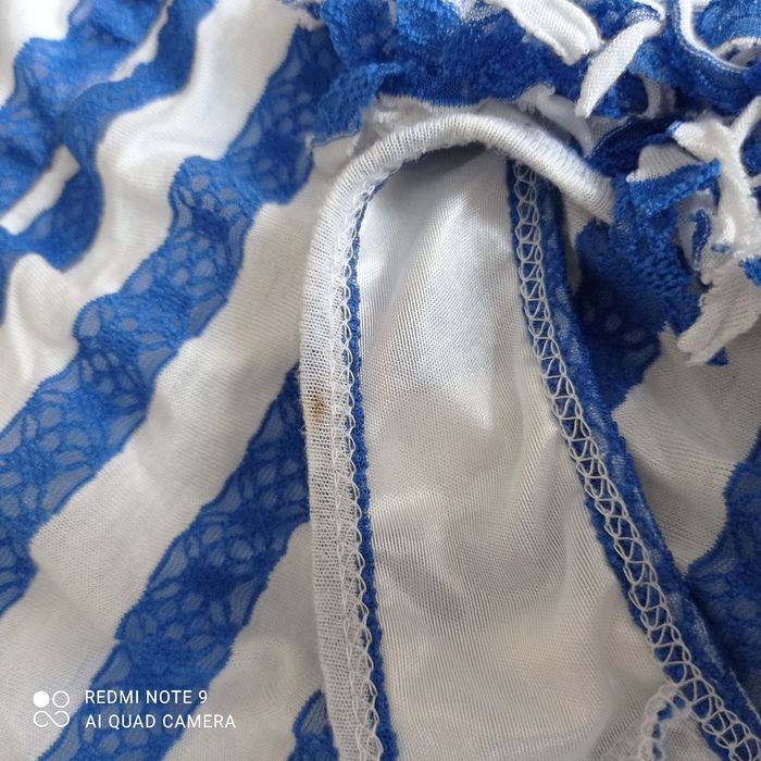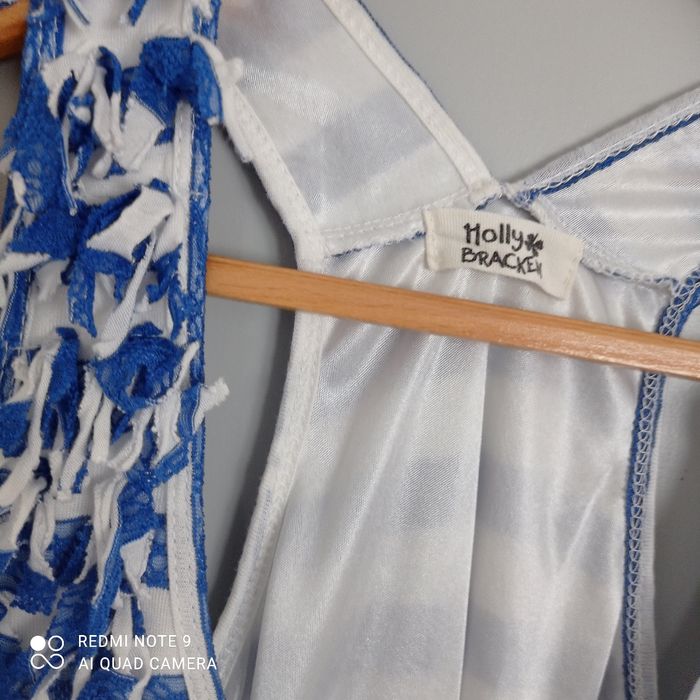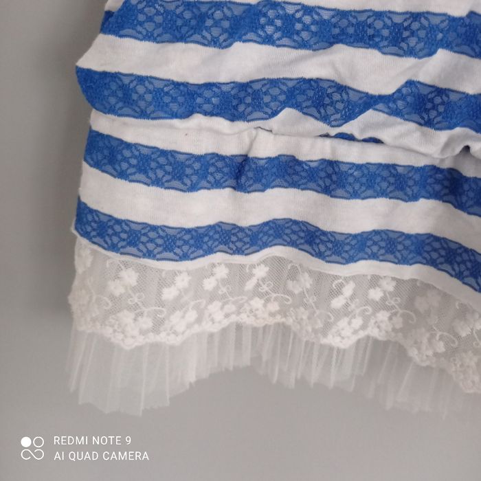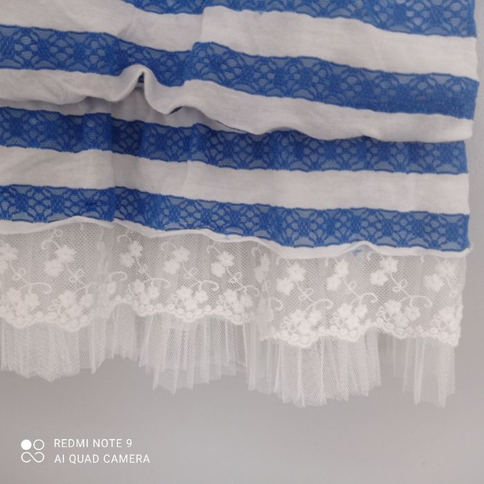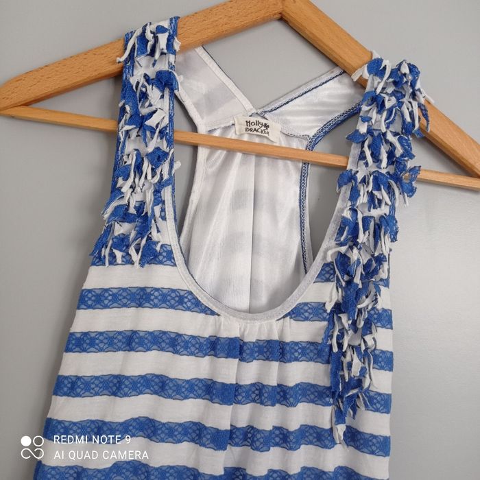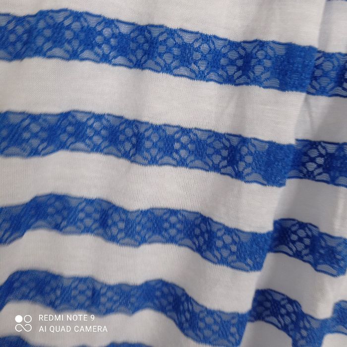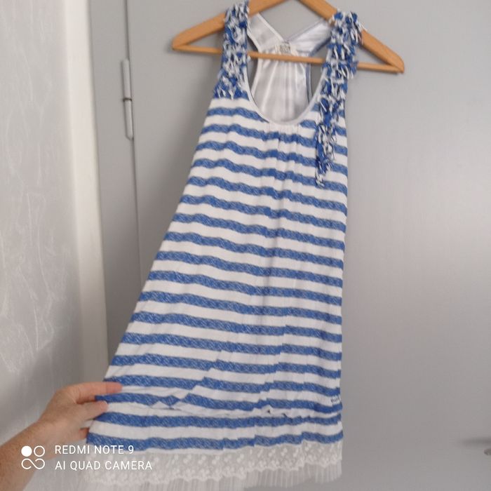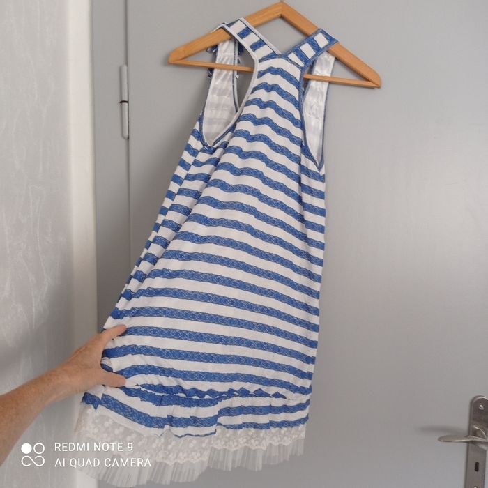Rayures horizontales bleues et blanches. Larges bretelles. Tulle en bas. Une mini tache à l' intérieur d une bretelle qui ne se voit pas porté. Voici les mesures prises à plat : aisselles : 43cm, longueur : 88cm. C9