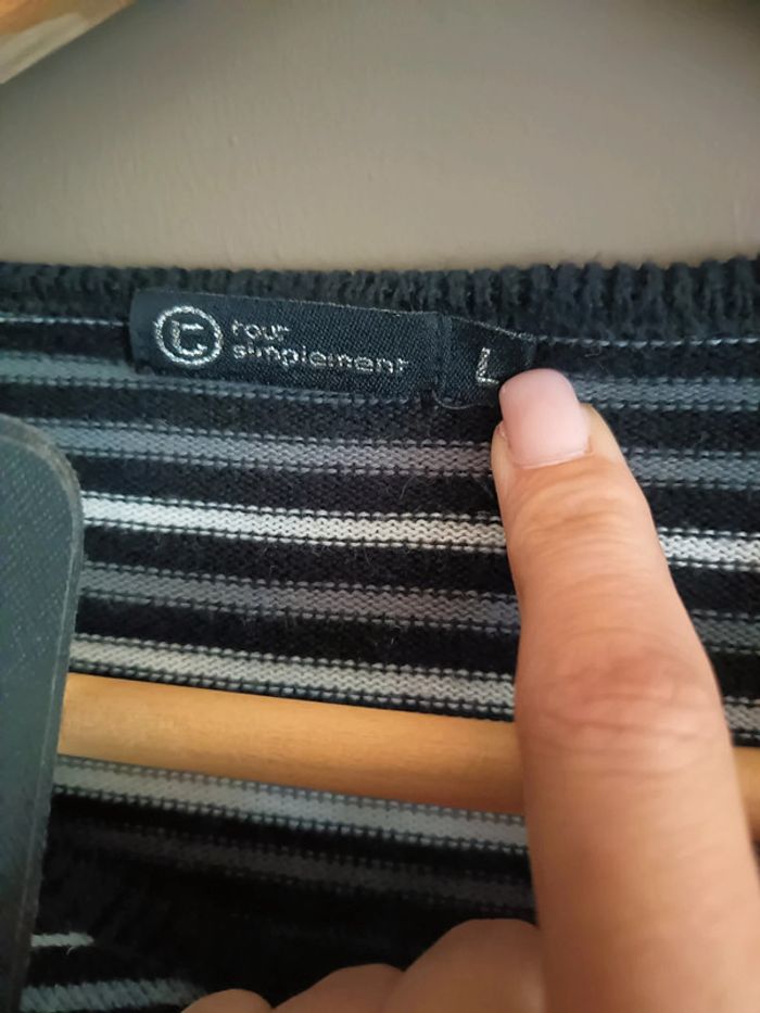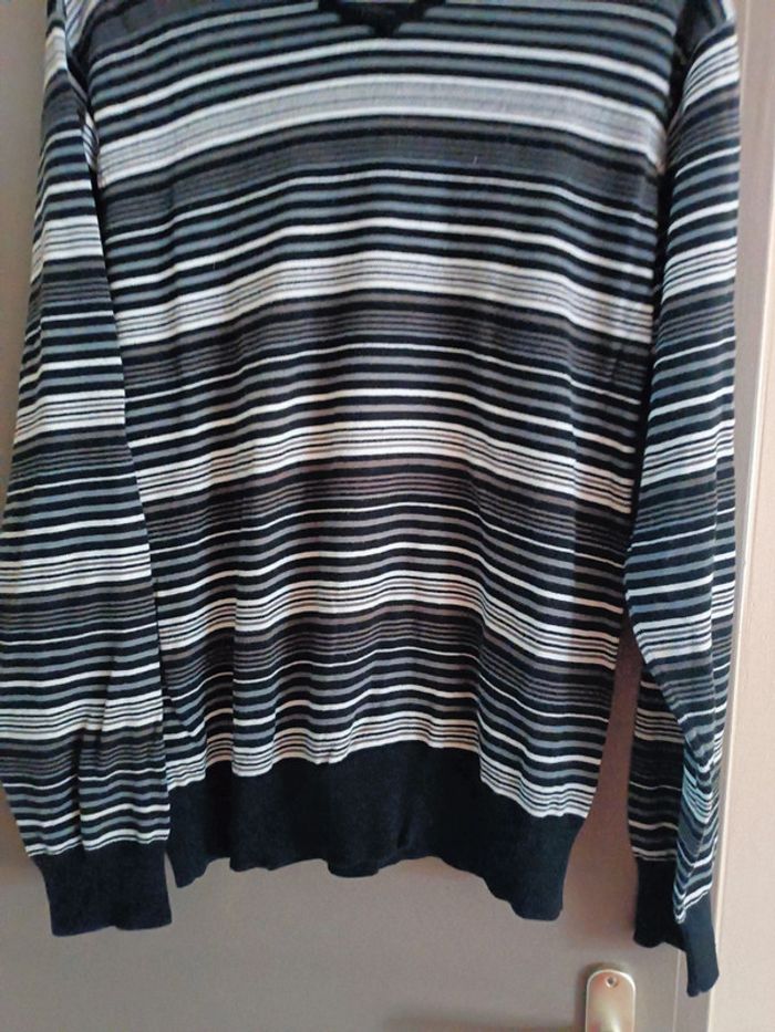 🙋🏼‍♀️ Bonjour 🛍️ Lot activé jusqu'à 15% 😃 📬 Envoi rapide entre 24h / 48h Joli pull homme À rayures Noir, gris et blanc Tout simplement Taille L N'hésitez pas à regarder mon dressing et faire des lots pour profiter des frais de port 😁