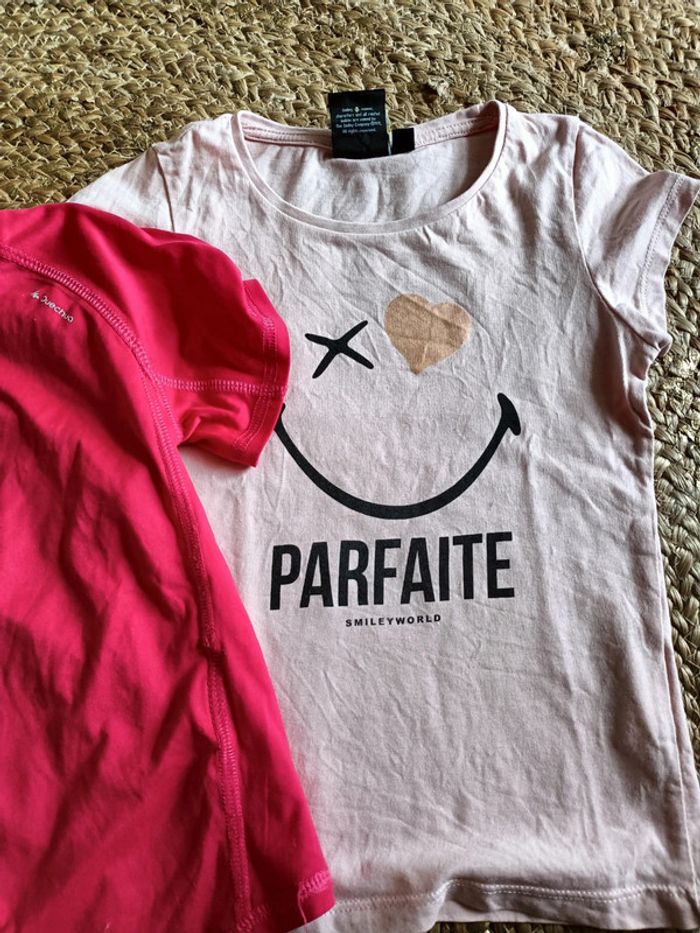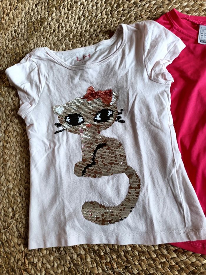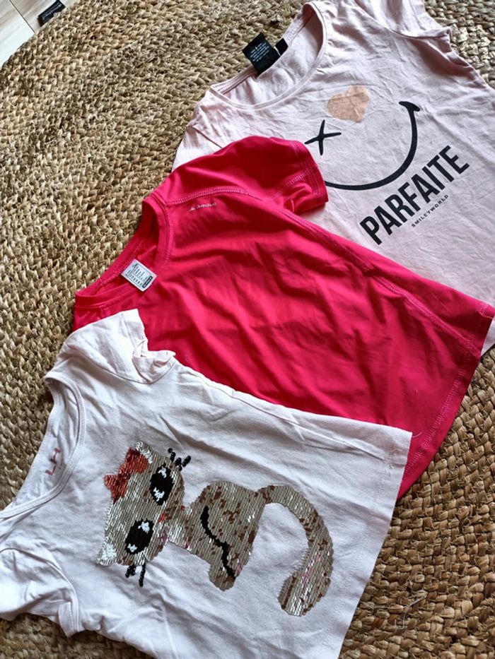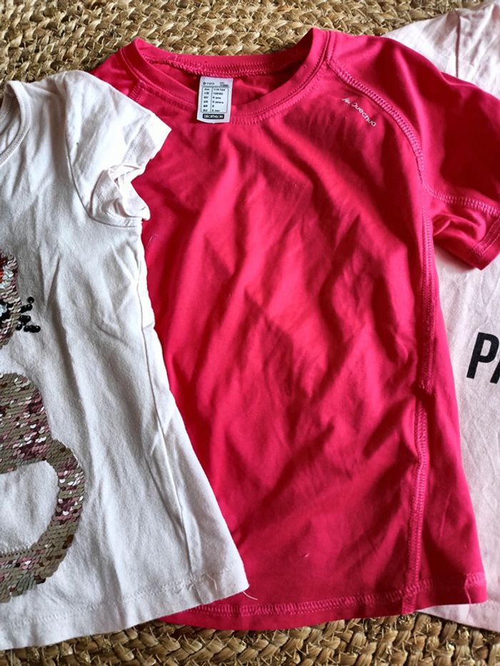 Lot de 3 tee shirts enfant Fille Rose Sequin, changeant, La halle, Decathlon Taille 6 ans N'hésitez pas à regarder mon dressing et faire des lots pour profiter des frais de port 😁