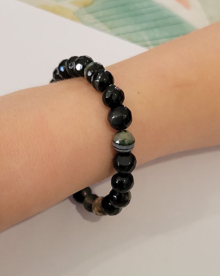 BRACELET PERLES MARBREES GRIS ET NOIR + 1 PERLE DORE ! NEUF ! - photo numéro 3