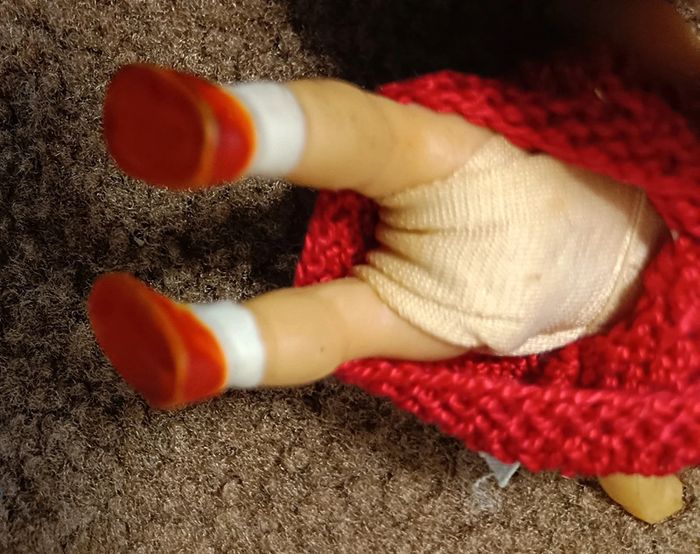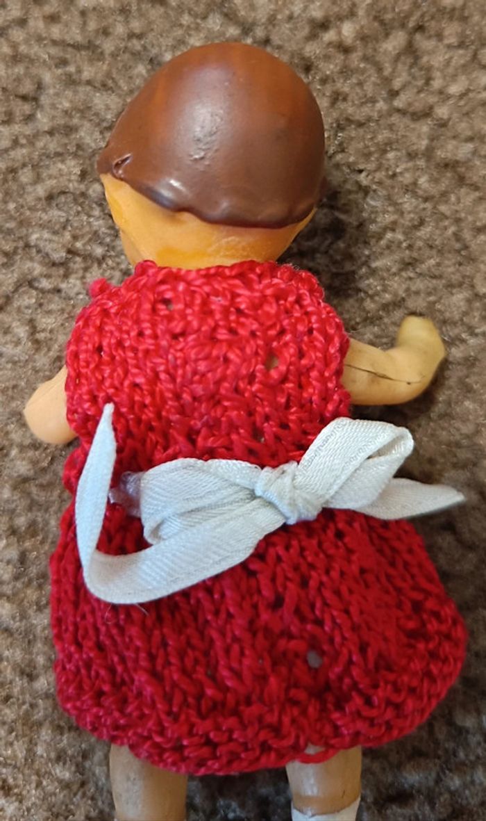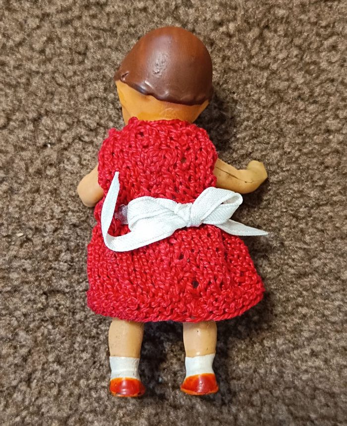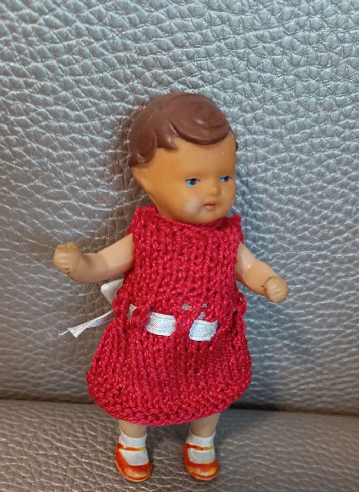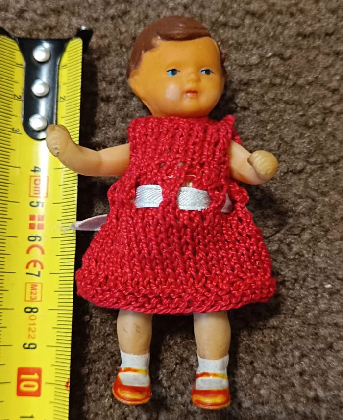 Petite poupée vintage allemande en caoutchouc Ari Baby Doll - 1960s Yeux bleus Mini poupée ancienne Robe crochet et tenue vêtements maison non fumeur et sans animaux n'hésitez pas à faire des lots figurine collector jouet poupée peluche vintage