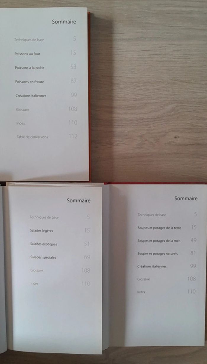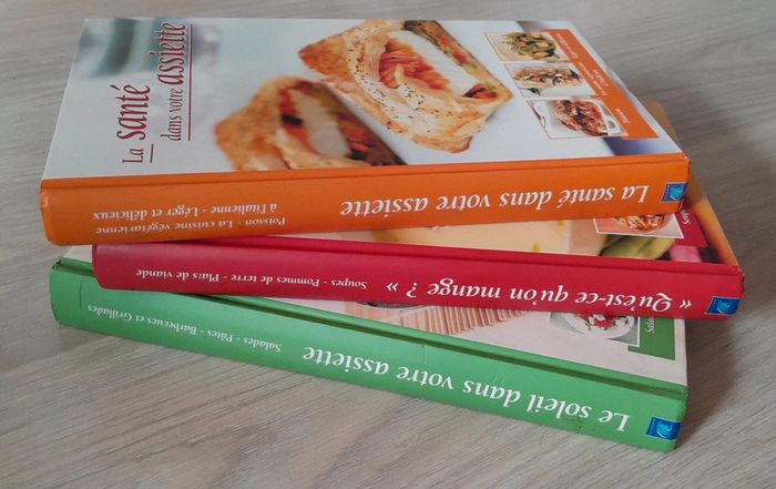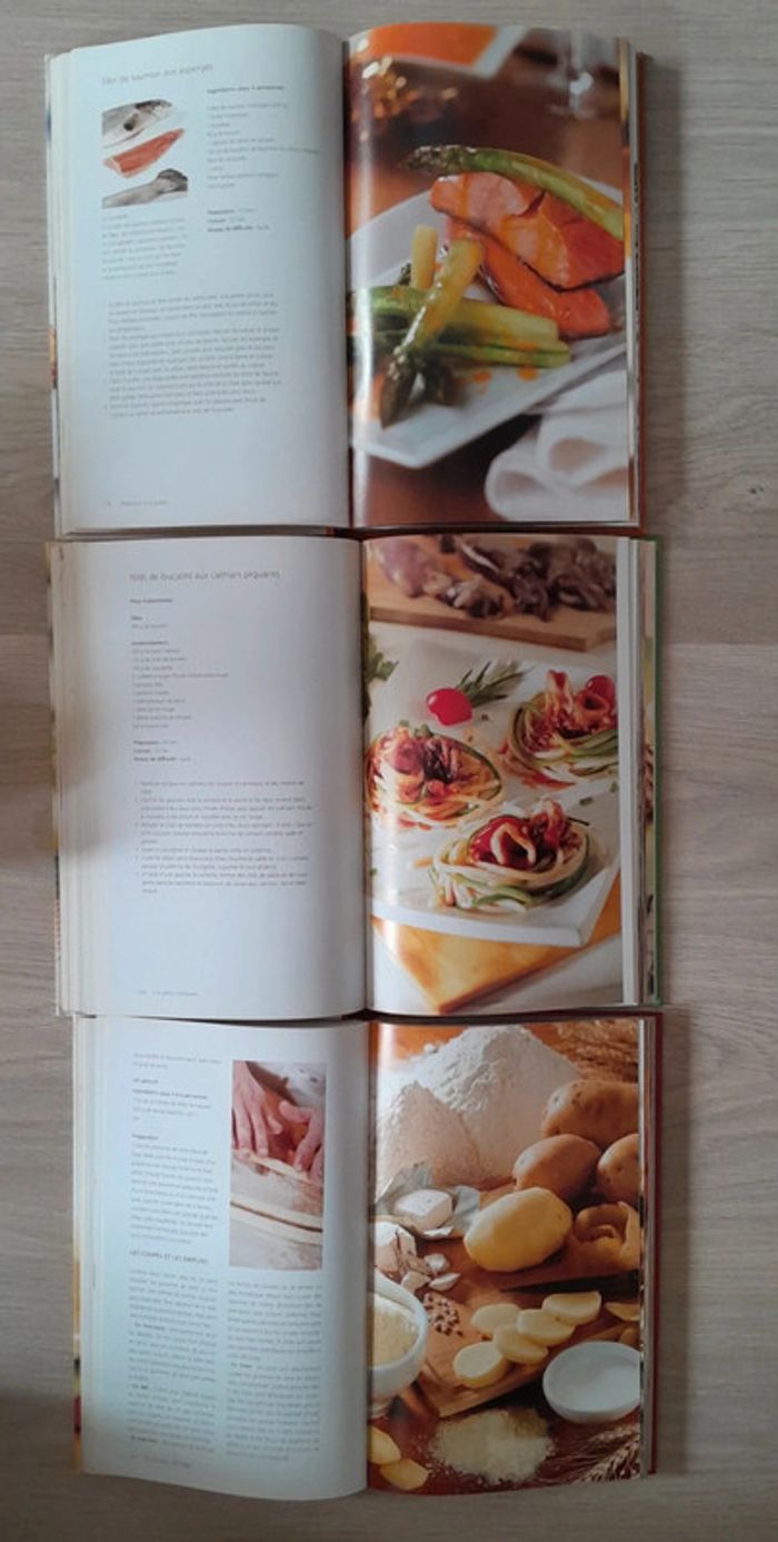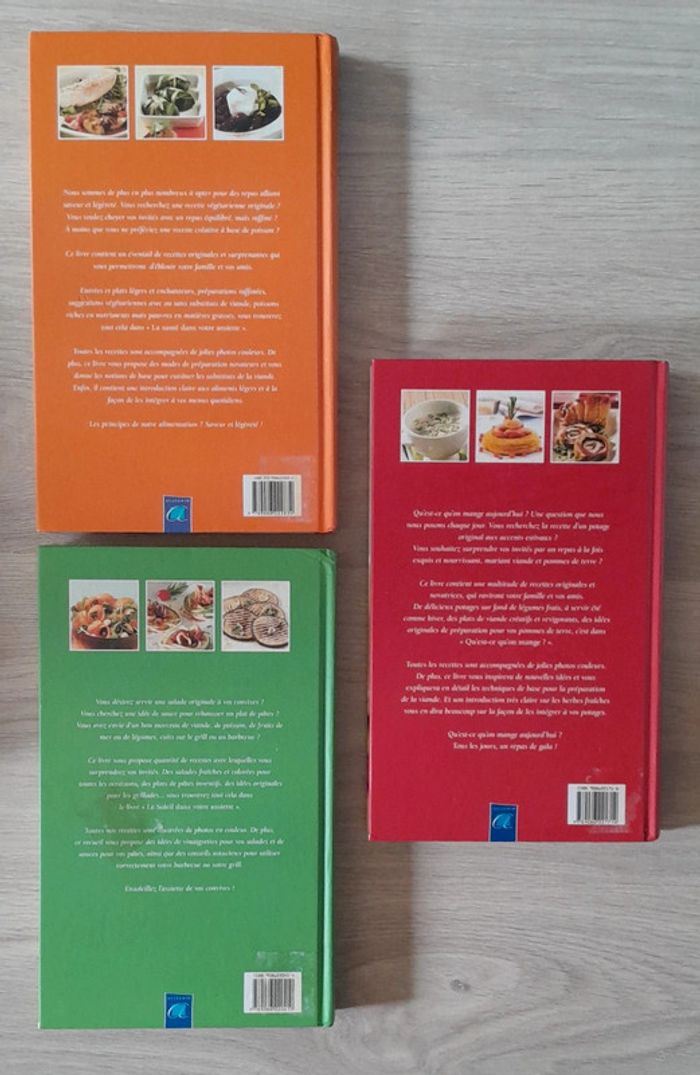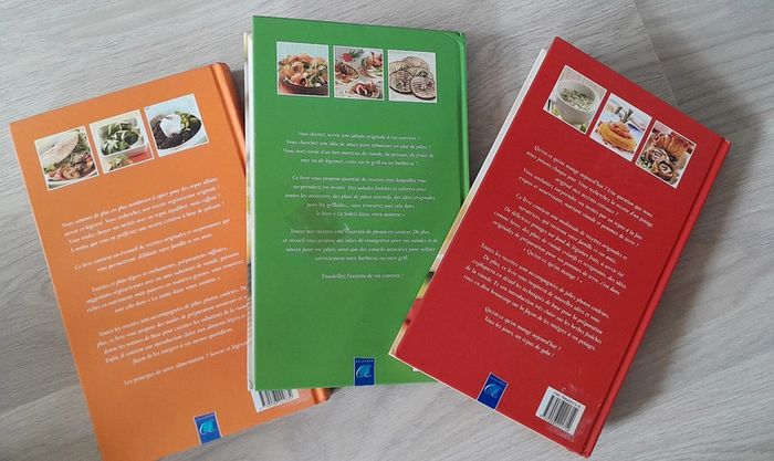 10 euros le lot de 3 livres lot indissociable 29x18cm 335 pages chacuns Poisson, la cuisine végétarienne italienne, salades, pâtes, barbecues, grillades, soupes, pommes de terre, plats de viande