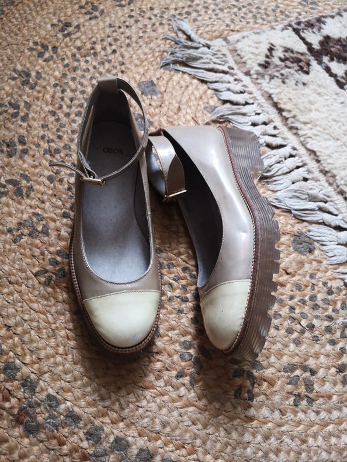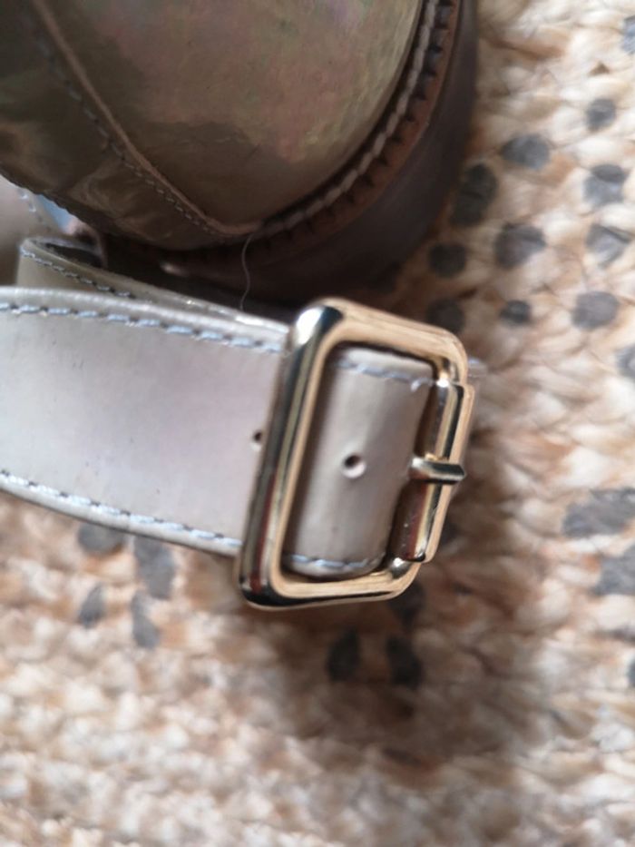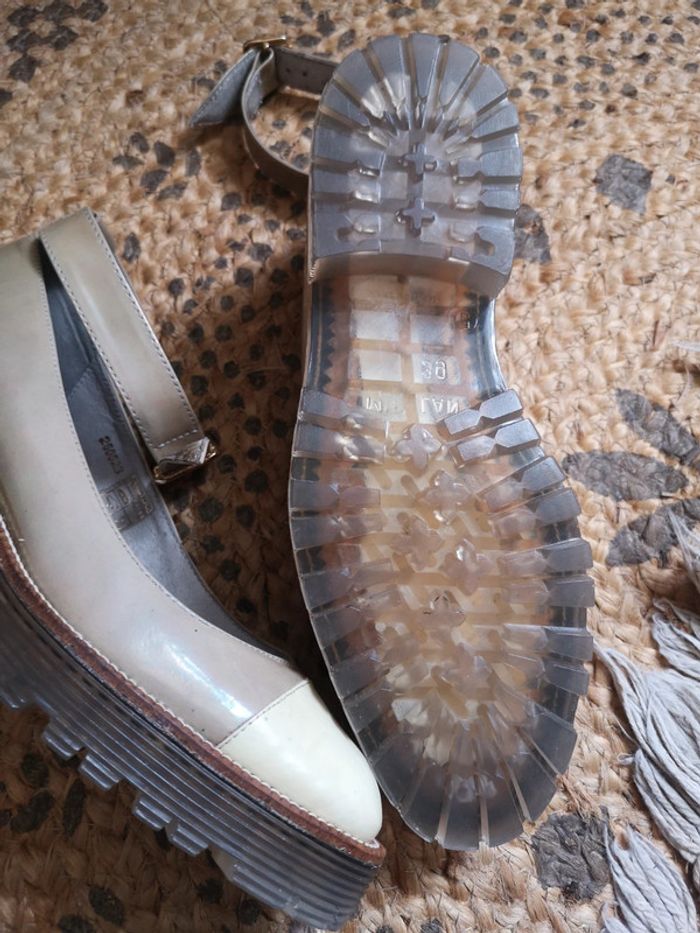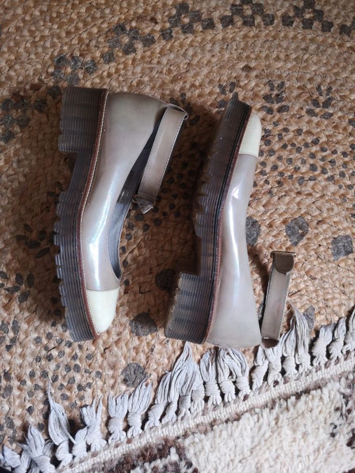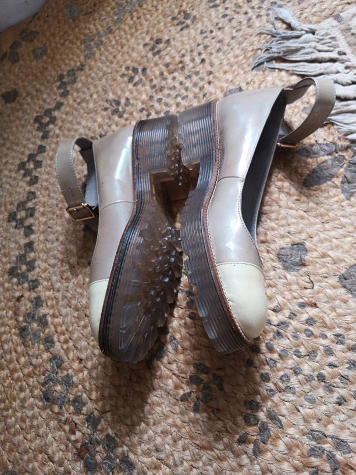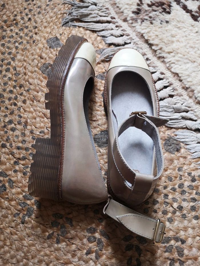 T. Bon état, cuir intérieur et extérieur, vernis bicolore légèrement irisé, plate-forme type Doc Martens, lanières aux chevilles avec boucles métalliques dorées. Hauteur plate-forme 2.5 cm. Talon 4.5 cm. Très confortables.