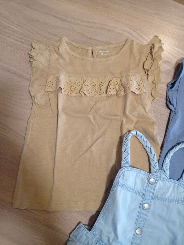Ensemble 18 mois Robe Tape à l'oeil Chambray Tee shirt moutarde détail volant en broderie anglaise Bout'chou Tee shirt bleu détail broderie anglaise Tape à l'oeil Comme neuf