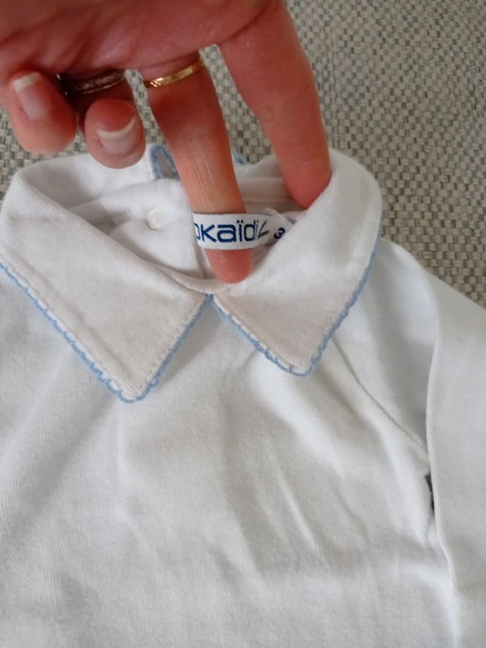 Lot 2 pyjamas Petit Bateau Un velours rayé blanc et turquoise Un pyjama fin sans manche, blanc avec étoiles bleues+ bodie manche longue a col blanc Okaïdi + bodie manches courtes rayé bleu et blanc tex