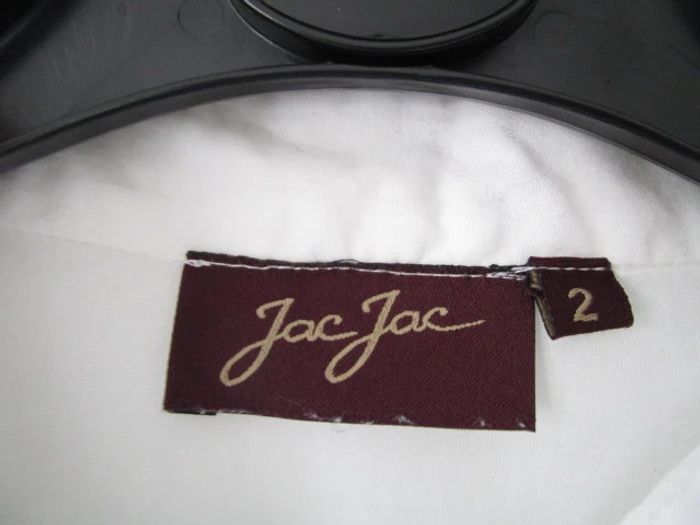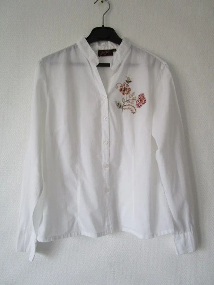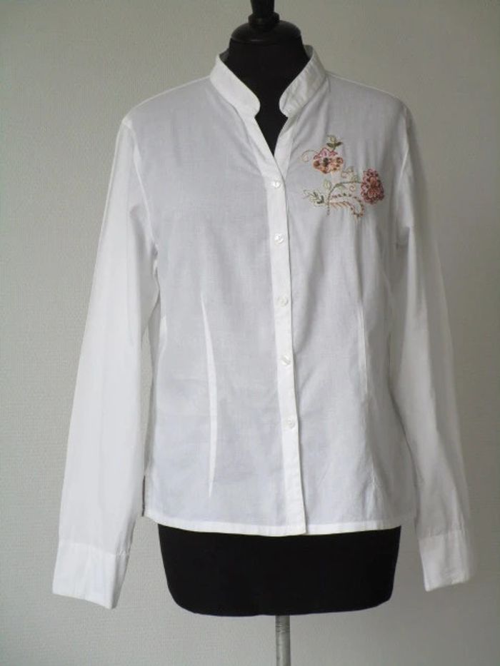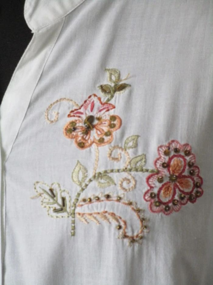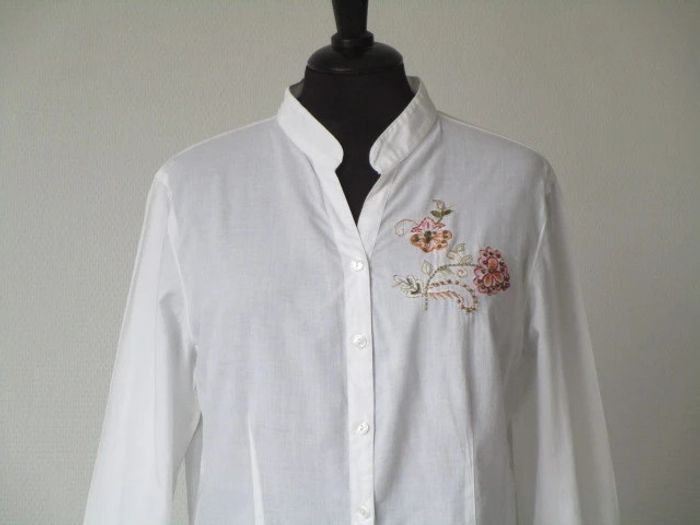 Chemisier blanc sans col vintage Motifs brodé fleur sur le côté gauche avec fines perles Taille 2, correspond à du 40 (cf mesures) Coupe cintrée Manches longues 100% coton Largeur carrure : 41 cm Largeur aisselle à aisselle : 52 cm Longueur : 59 cm En très bon état #mamanbrade59femme40