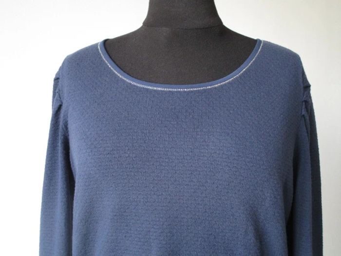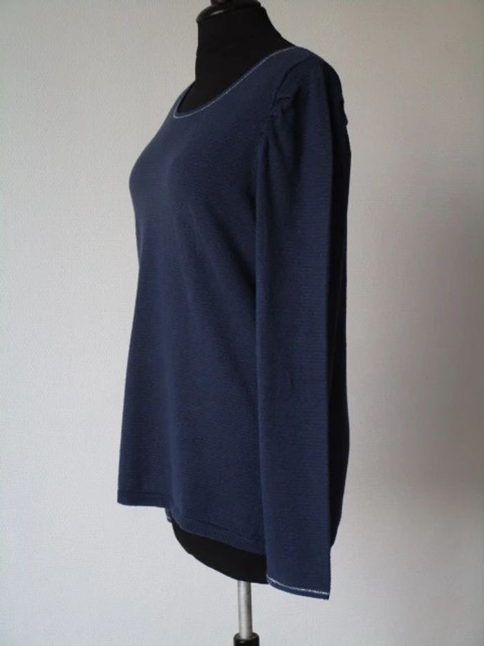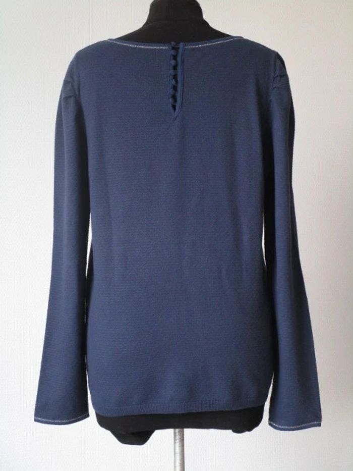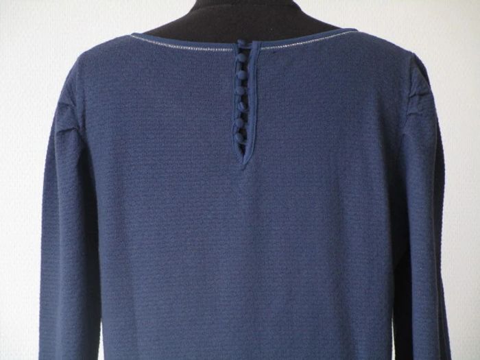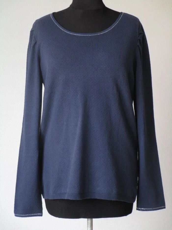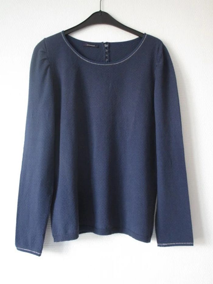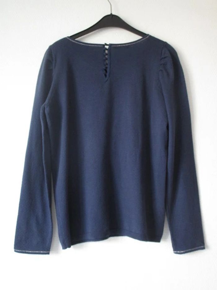 Pull bleu de marque Promod taille L Col rond Manches longues Petit liseré argenté autour du col et des poignets Petits plis sur le haut des manches Boutons dans le haut du dos Maille travaillée 85% coton / 15% nylon Largeur carrure : 36 cm Largeur aisselle à aisselle : 51 cm Longueur : 63 cm En très bon état #mamanbrade59femme40
