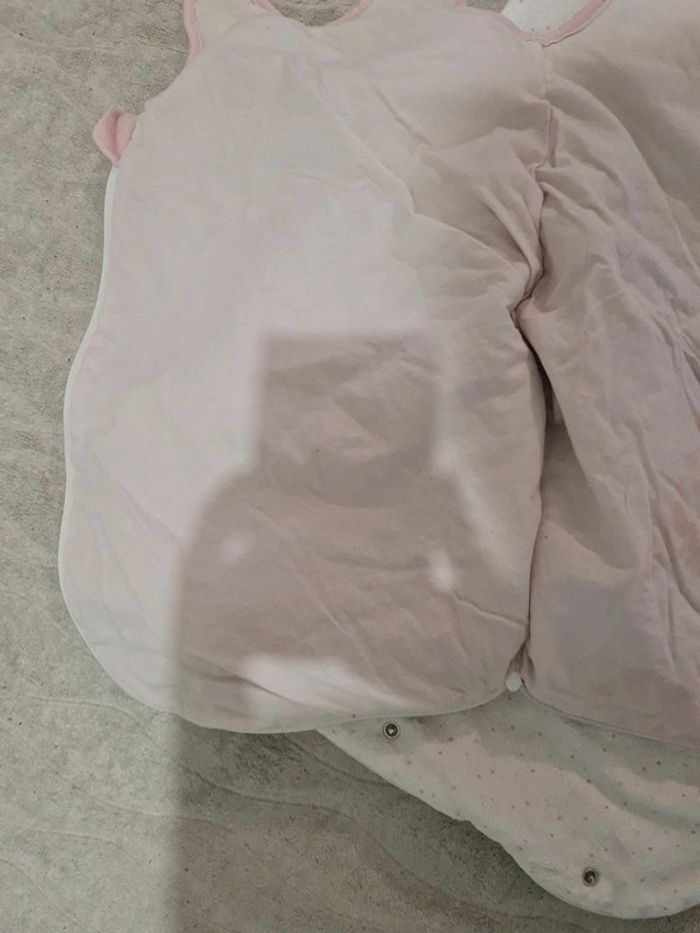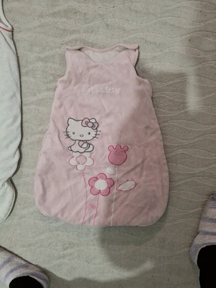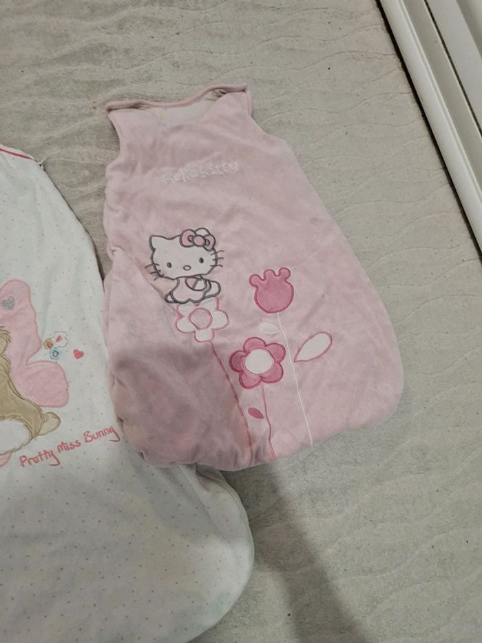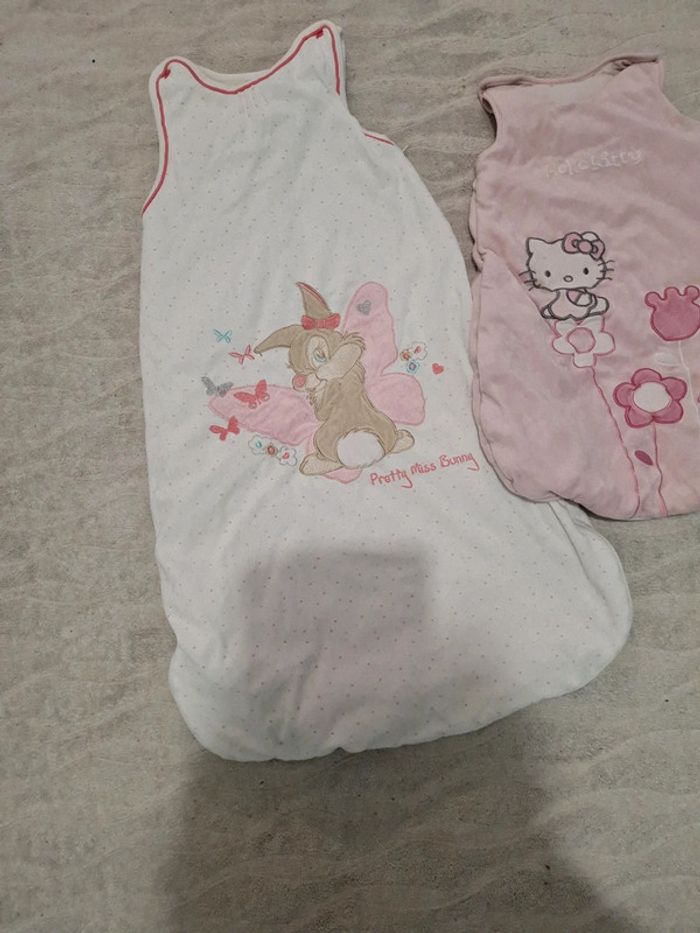 1 gigoteuse bunny 6.24 mois 1 hello kitty 0.6 mois Les 2 gigoteuses ne sont ni déchiré ni abîmé elles sont en bon état générale avec quelques imperfections niveau couleur voir photo pr la rose c à l'intérieur de la gigoteuse mais vraiment pas gênant en soi
