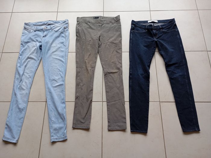 Lot de 3 jeans stretch qd on tire sur le tissus il est élastique taille 38 Un kaki Jennyfer kaki très bon état mais un peu passé à des endroits il n'a pas de fermeture éclair ni de bouton à la taille Un bleu clair Pimkie très bon état Un bleu foncé Hollister très bon état sauf sur les fesses le tissus fait des petits points blancs voir photo