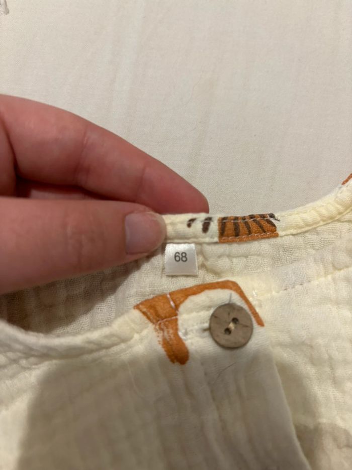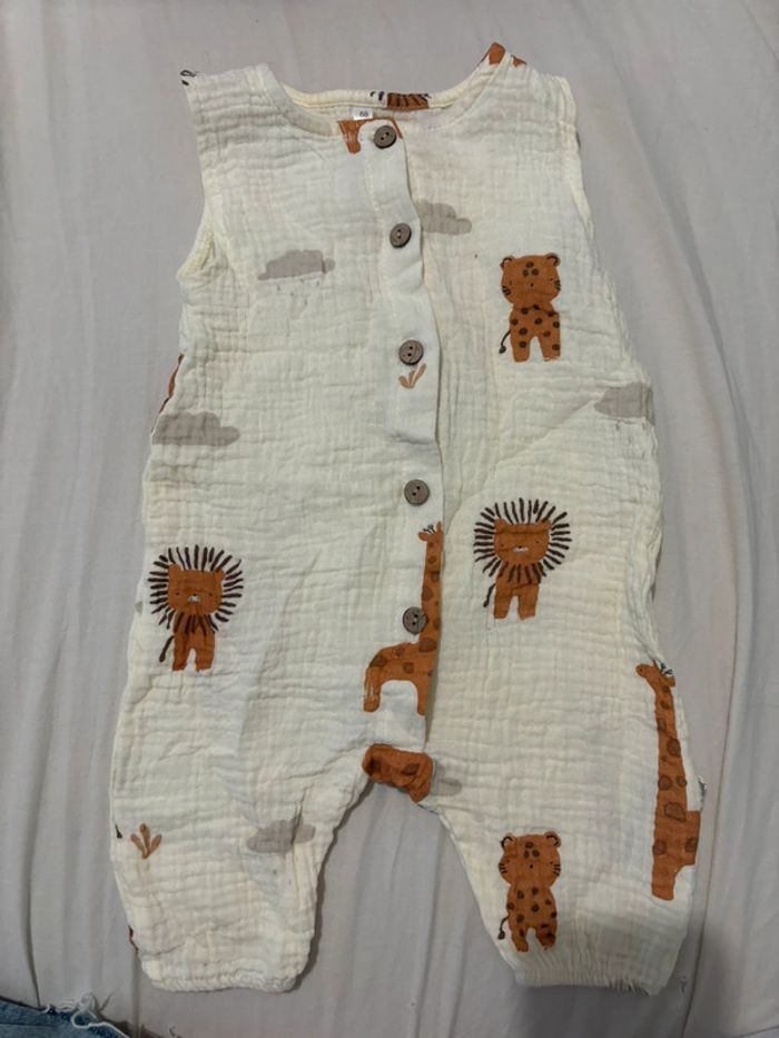Combinaison en gaze de coton couleur crème motifs lion 🦁 et girafe 🦒 Très bon état jamais porté Taille 68 cm