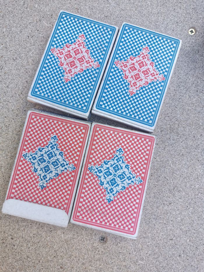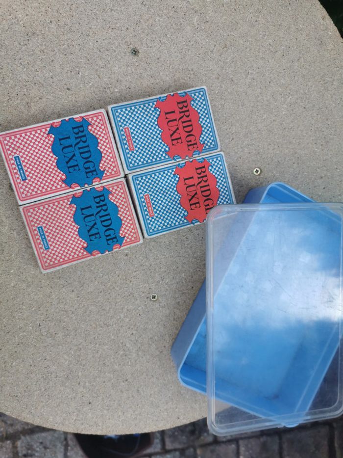 Jeux de cartes bridge de luxe vintage, en très bon état général, fabriquées en France, les boîtes de cartes sont défraichies et comportent des taches de jaunissement ou viellesse, éventuellement de légères déchirures sur le côté. Le lot de 4 paquets de cartes : 2 rouges et 2 bleues. Le lot est à 50€ à l'unité 15€ le paquet. Le poids d'un paquet 106g, le poids du tout le lot avec la boîte en plastique 584g. Pensez à faire des lots afin de bénéficier des remises que j'ai régulièrement sur ma page. #jeuxdecartes #jeudecartes #bridgedeluxe #bridge