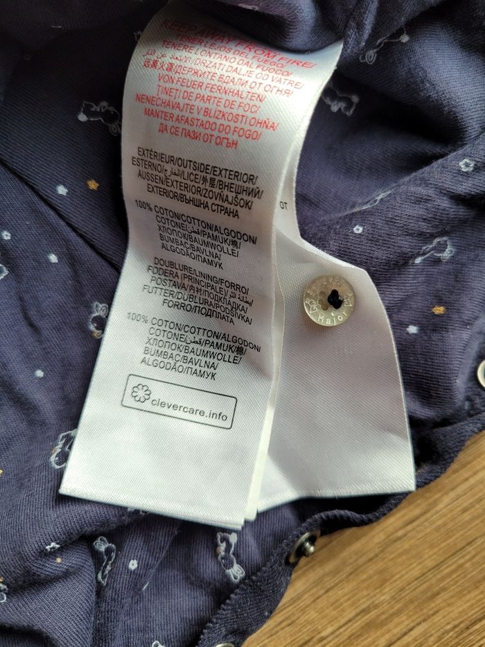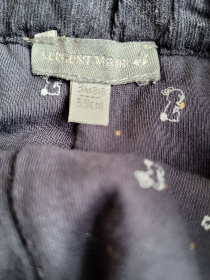 Salopette en velours, doublure et ouatinée, en très bon état, très peu portée. Motif lapin sur la poitrine, ouverture intégrale à l'entrejambe par boutons pressions. Marque Sergent major, taille 3 mois/59 cm