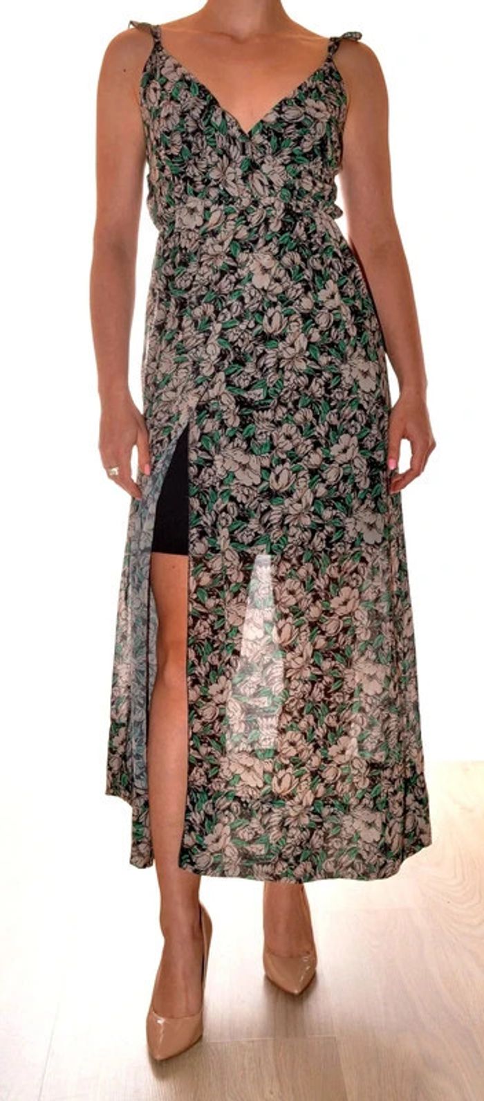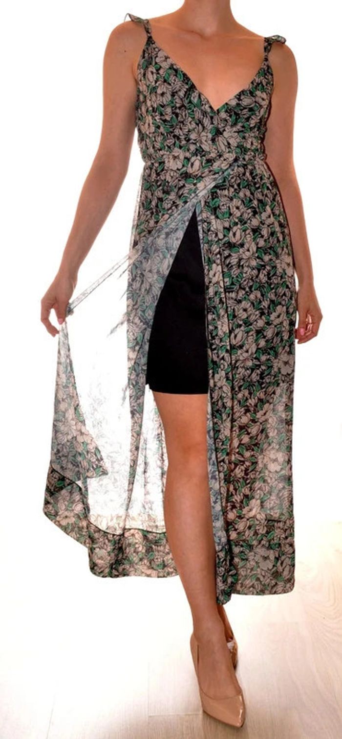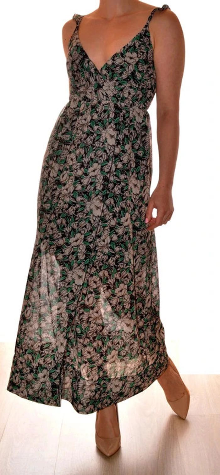 Longue robe taille M motif floral col V doublée élastiquée avec fente jambe - photo numéro 1